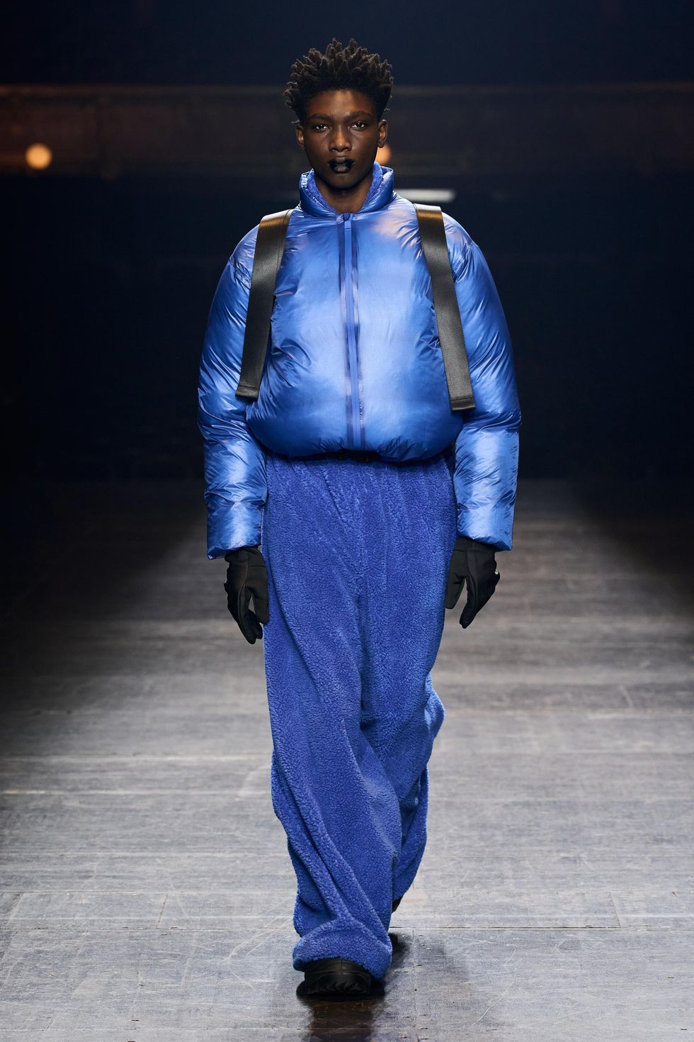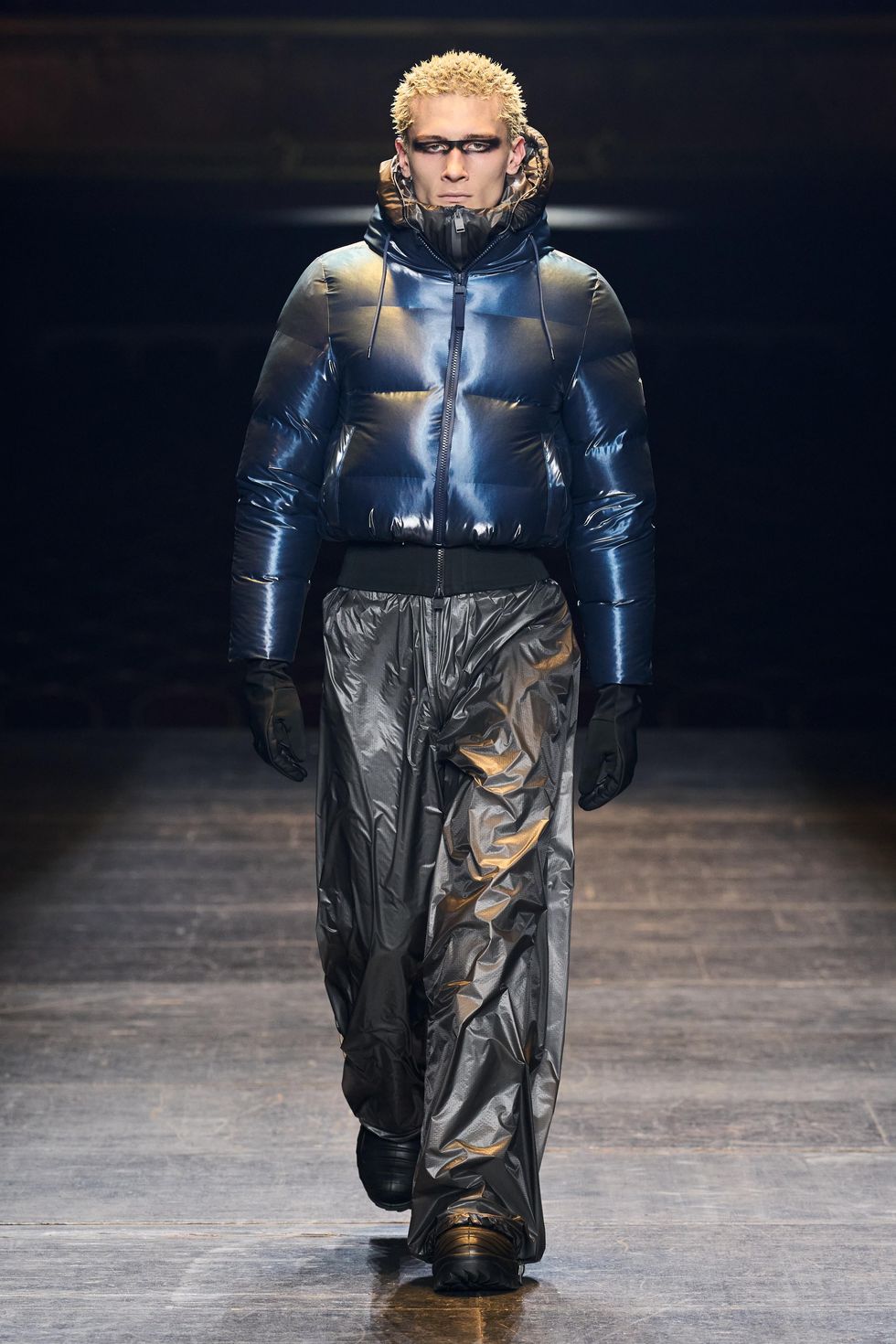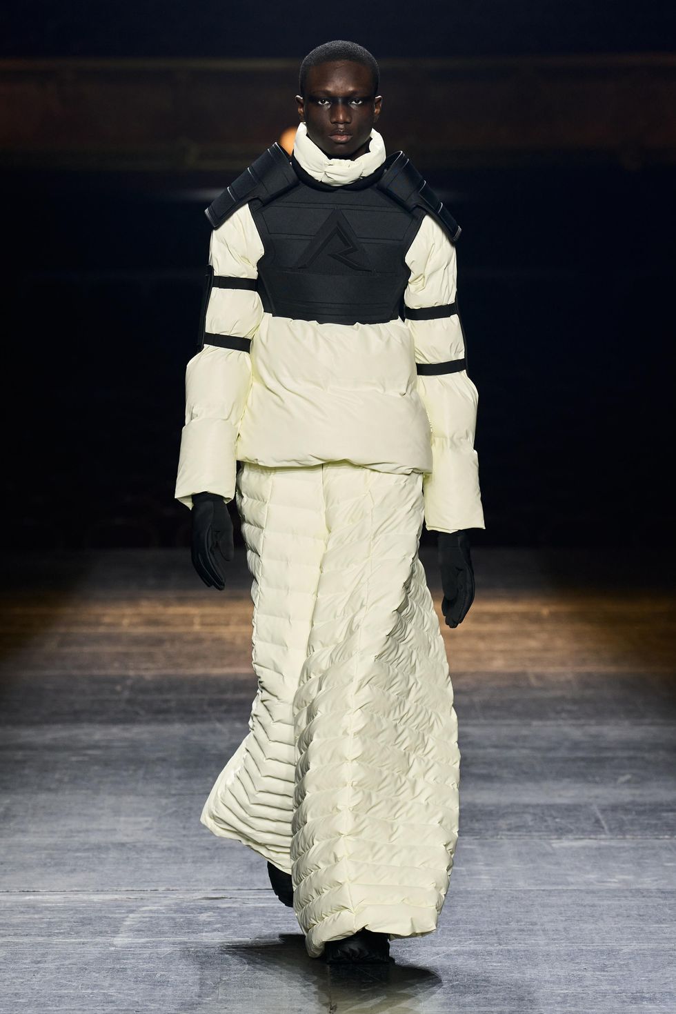 With each look the hero theme evolved as an idea about forward momentum, grounding and positivity. Silhouettes spilled to the ground in columns of technical fabrics and extended beyond reality. Other superhero iconography include theatrical capes, extended collars and new branding with a HERO application.