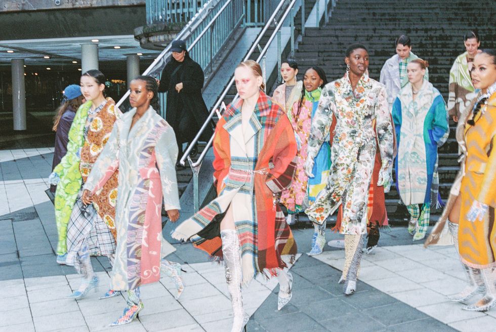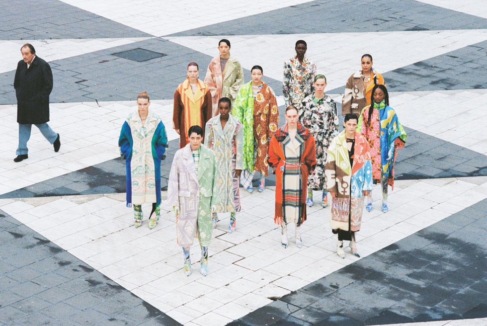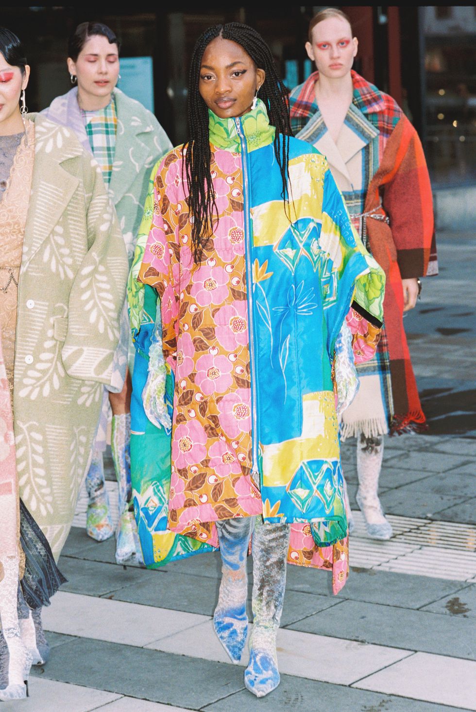Josephine Bergqvist and Livia Schück, the duo behind Swedish fashion label Rave Review, were among the 15 talents asked to take part in the digital festivities this week. Their 2-minute film "Jord, Luft, Eld Vatten" premiered yesterday, which sees a cast of models taking over Stockholm's central city square to show off the brand's loud statement coats and colorful patchwork pieces.