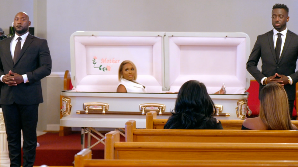 Mind you, nobody knew why they were showing up to a funeral home, let alone at midnight. This coffin wasn’t there to begin with either. It was carried in after the women had already taken their seats. Suddenly, up comes Quad entirely in white, silhouetted by the words “Mother” embroidered on the underside of this pristine coffin. Mother indeed!