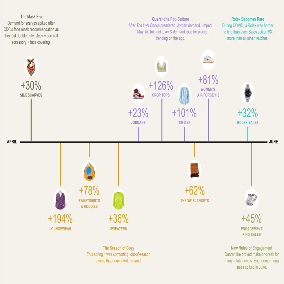 Trends related to COVID-19 and WFH culture began an ascent almost as soon as the pandemic itself. In April, as face masks faced a shortage, the RealReal had a 30% rise in sales for silk scarves, which is a pretty chic alternative as demonstrated by the demand for Christian Siriano's masks.
