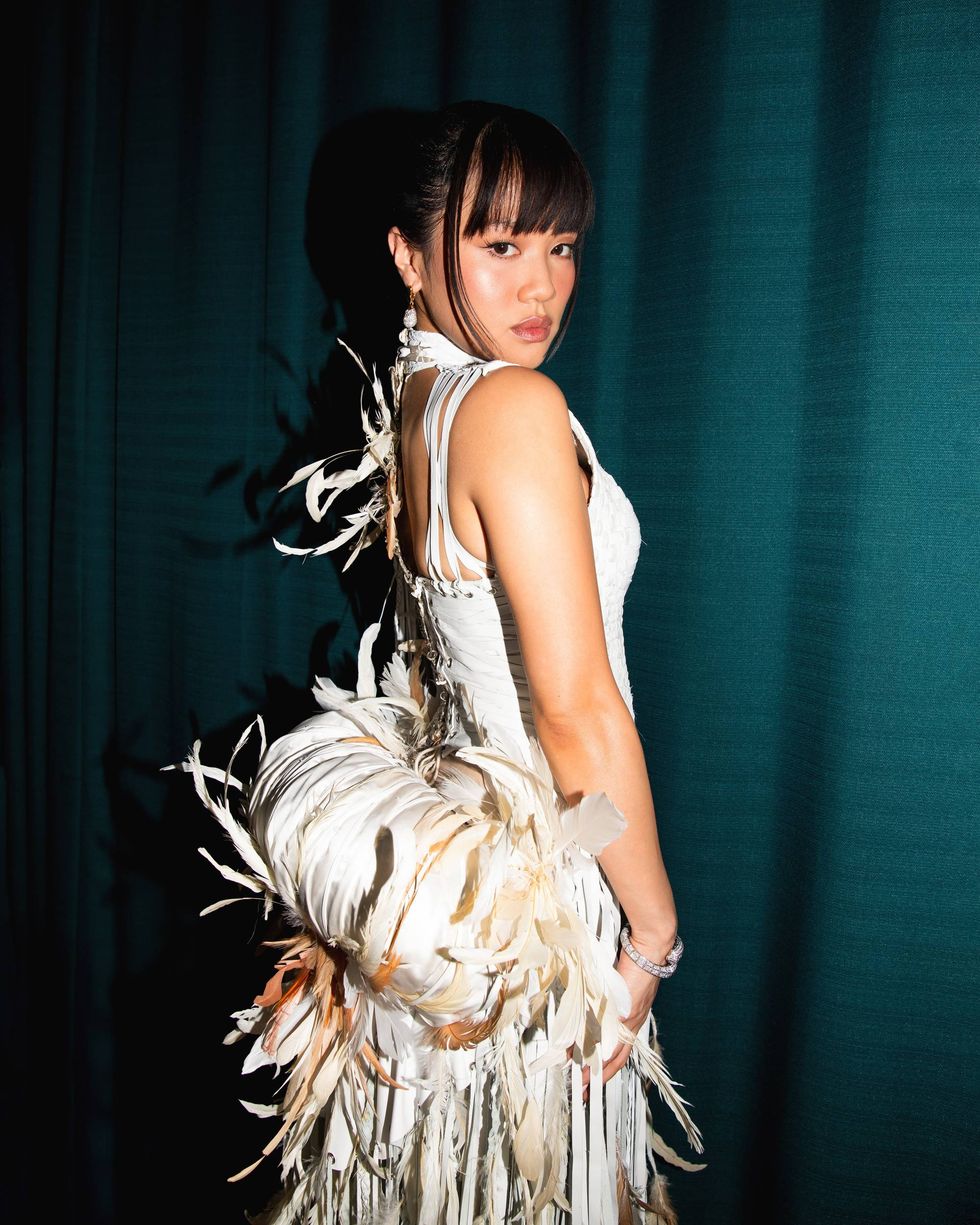 Custom designed by New York based fashion designer Guvanch, inspired by the Korean national flower Mu Kung Hwa, the look is an homage to Korea and Ami’s heritage. Sketched in less than 24 hours, and assembled over the span of 10 days, the intricate leather woven white gown is a representation of the resilience and history of Koreans. “We’ve always worked hard and showed up no matter the circumstances or challenges” Ami tells me. The mix of the durability of leather and the lightness of the feathers plays heavily on duality, thoughtfully thought out to represent Ami’s massive time of transition in this stage of her career and to pay homage to the film and her heritage.
