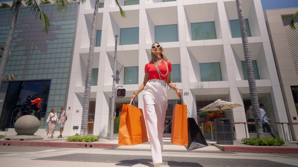 The episode also began with a slow motion shot of her leaving a store with used Hermes shopping bags. I don't know what they hoped to achieve with this shot, because the bags are clearly used and the outfit isn't Hermes — it's clearly supposed to be Chanel.