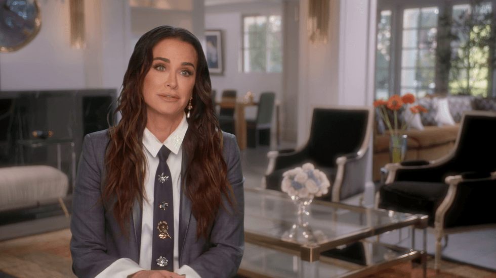 I am going to be brave and say that this is the best that Kyle Richards has ever looked in her 15 years as the star of The Real Housewives of Beverly Hills. She looks hot beyond belief, in ways I frankly did not think her capable of. I love this suit, and I love that she wore this suit during the episode in which she revealed to Erika (and the viewers) that she did in fact date a woman. Sure, she never actually said that, but Real Housewives fans notoriously cannot pick up on clues and subtext. Kyle Richards dated a woman, and she delivered the news in a suit. Not only that, but she embellished the tie with broaches and left fashion columnist Joan Summers wowed out of words.