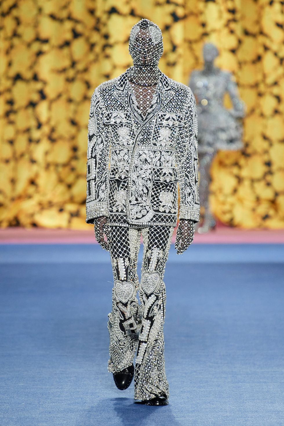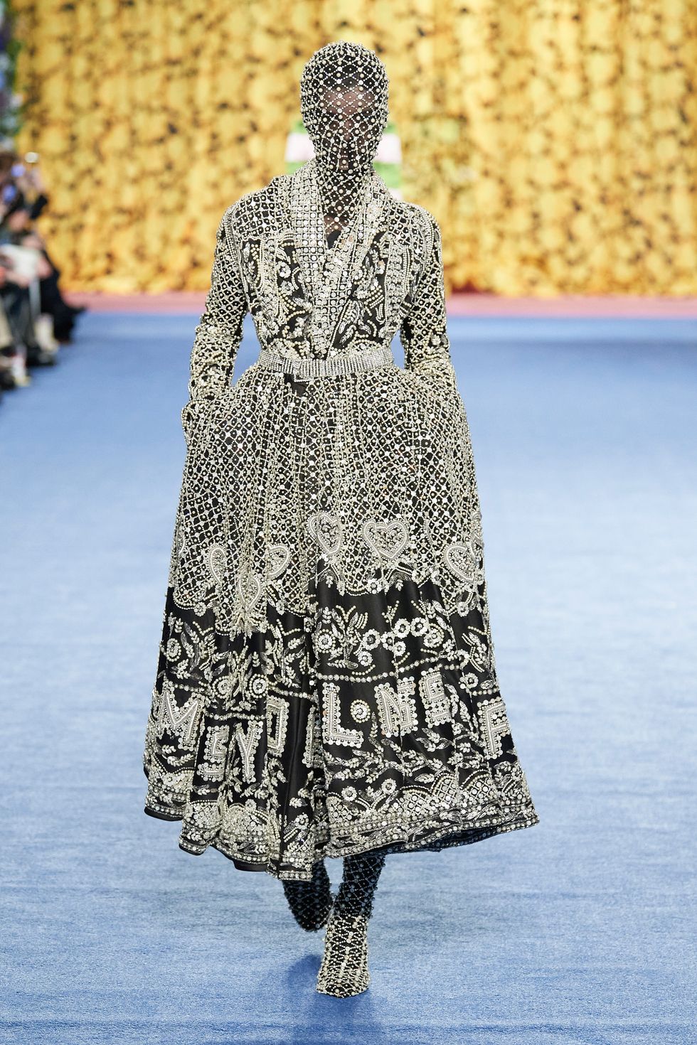 That same energy was carried over into Quinn's Fall 2020 show in London over the weekend, where he sent out a variety of models (including men for the first time!) in fully concealed getups that hid their faces. Among the most captivating were the opening series of bedazzled couture looks with "GOD SAVE THE QUINN" embroidered all over.