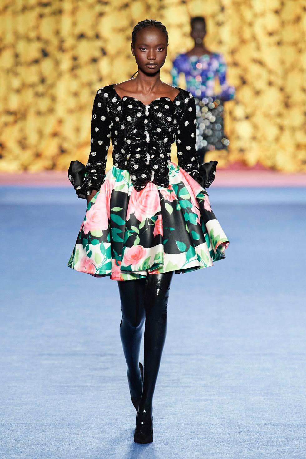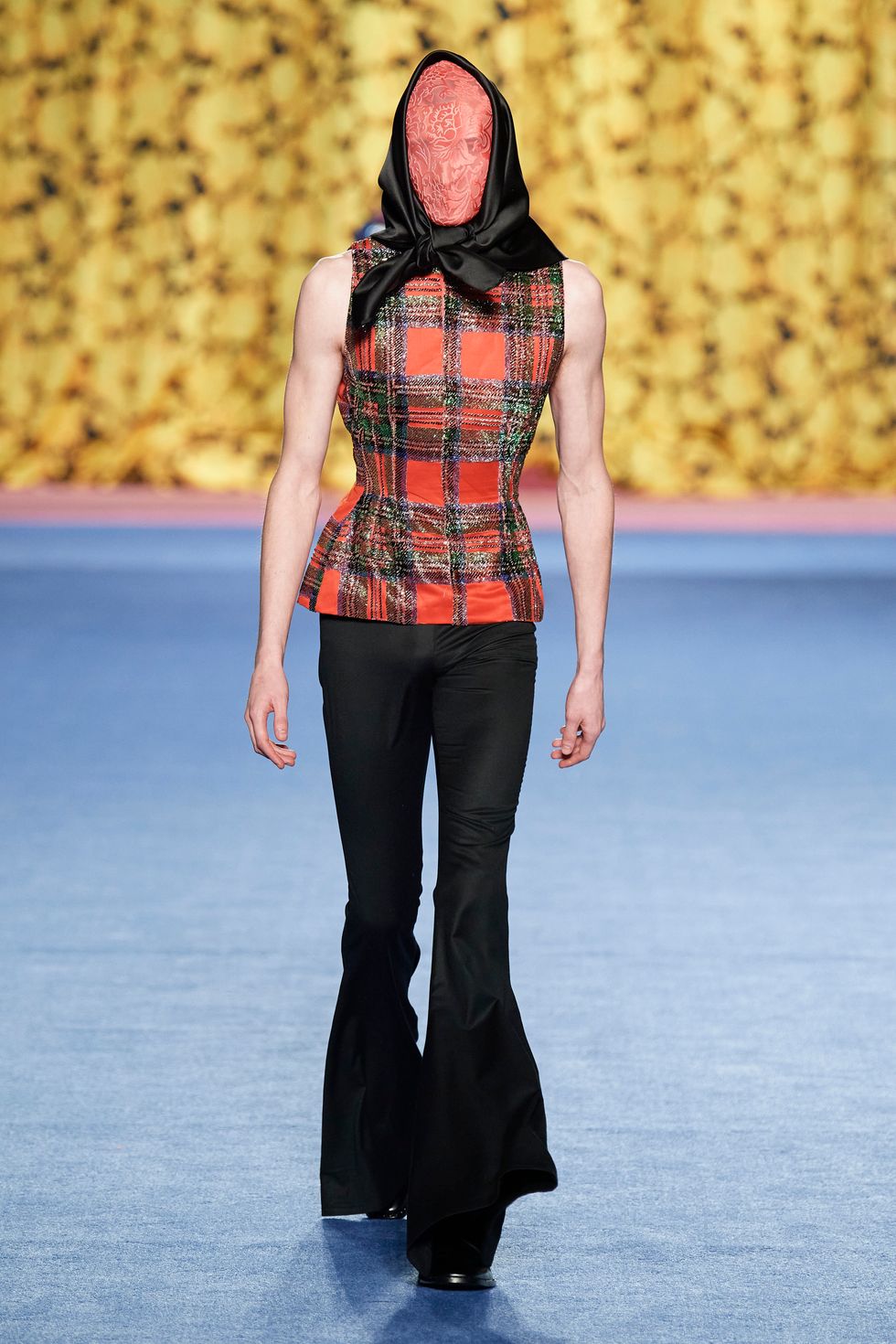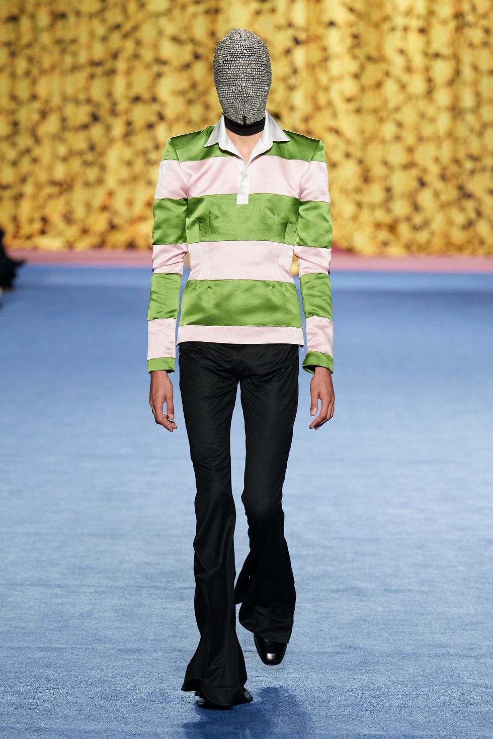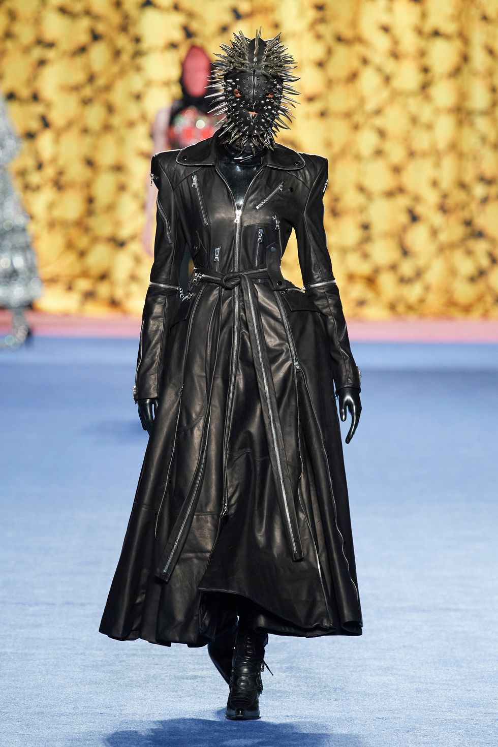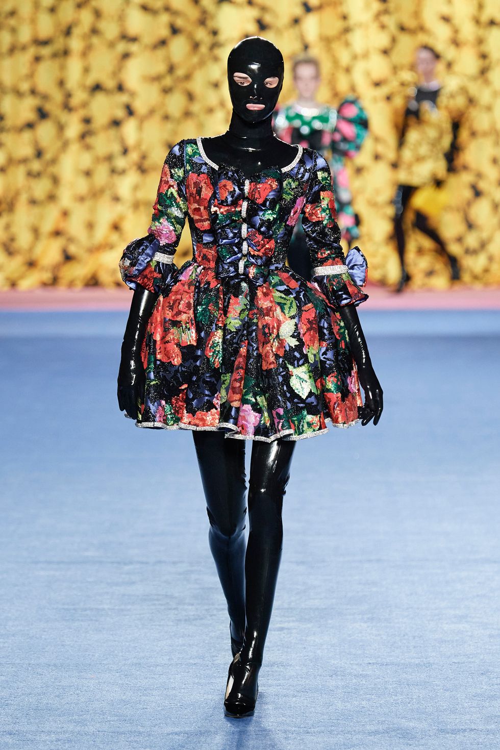 Other masked looks included a latex version with hole cutouts that appeared to reveal a covert Kendall Jenner, an S&M style with leather and spikes and a black and yellow number featuring Quinn's signature blown up florals.