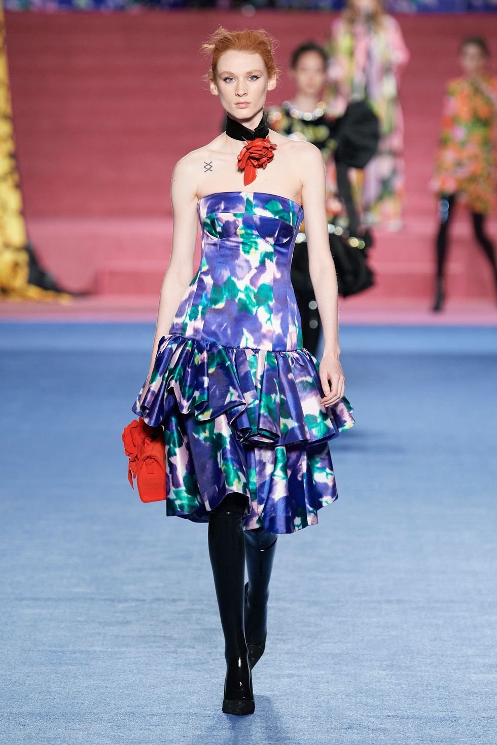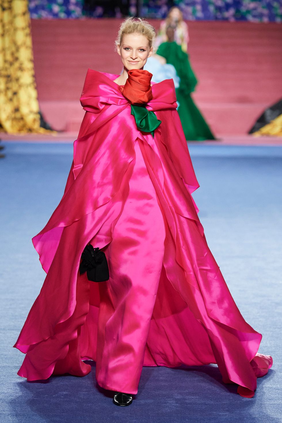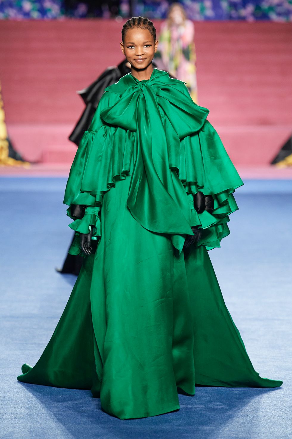 The rest of the collection focused on Quinn's mastery of custom prints, which he designs in his studio. Contrasting floral patterns, explosions of feathers and bright jewel-tone gowns looked resplendent on the runway, particularly as he incorporated some of those prints for the set.