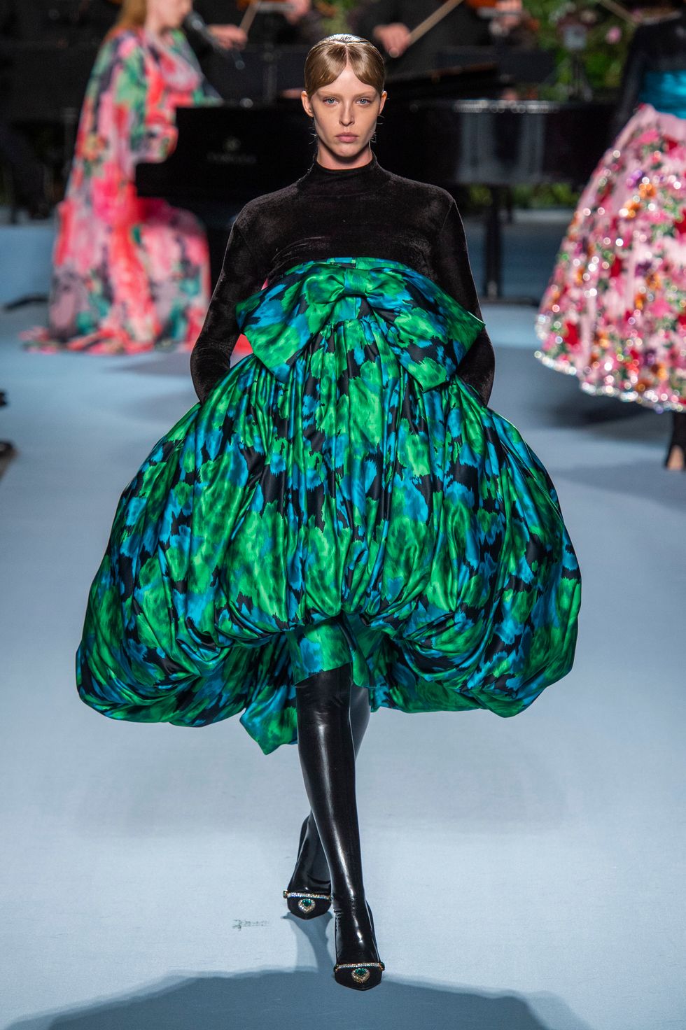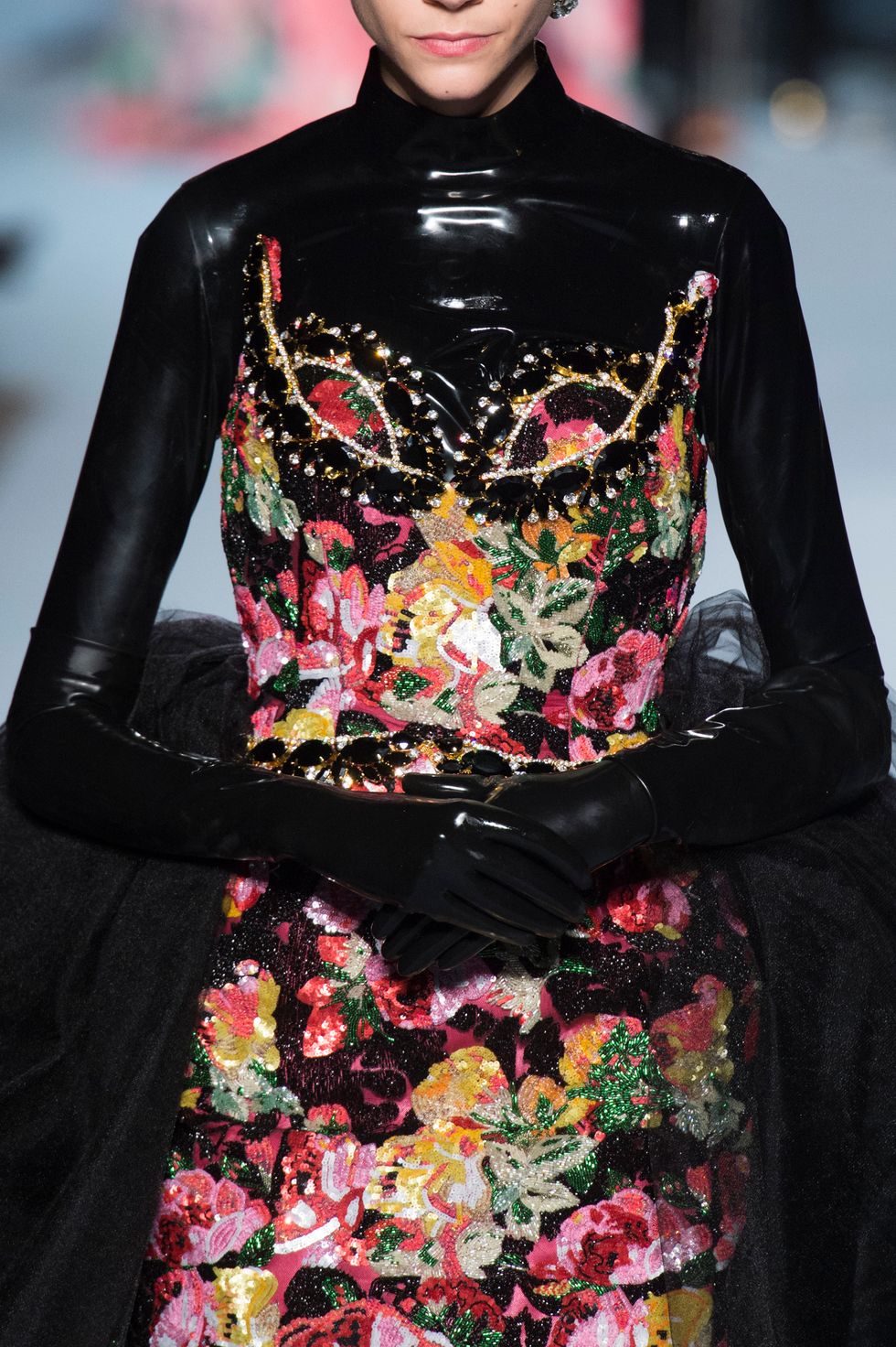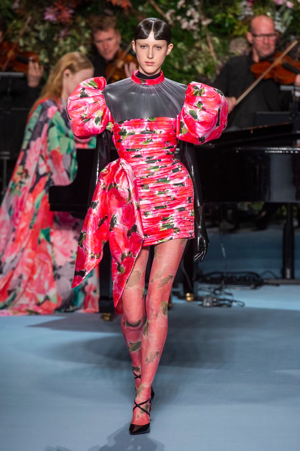 Many of the floral printed gown were layered over midnight black, super shiny latex bodysuits that went from toe to fingers. This gave the otherwise girlish looks an unconventional spin, while Freya Ridings played the piano and sang in the background.