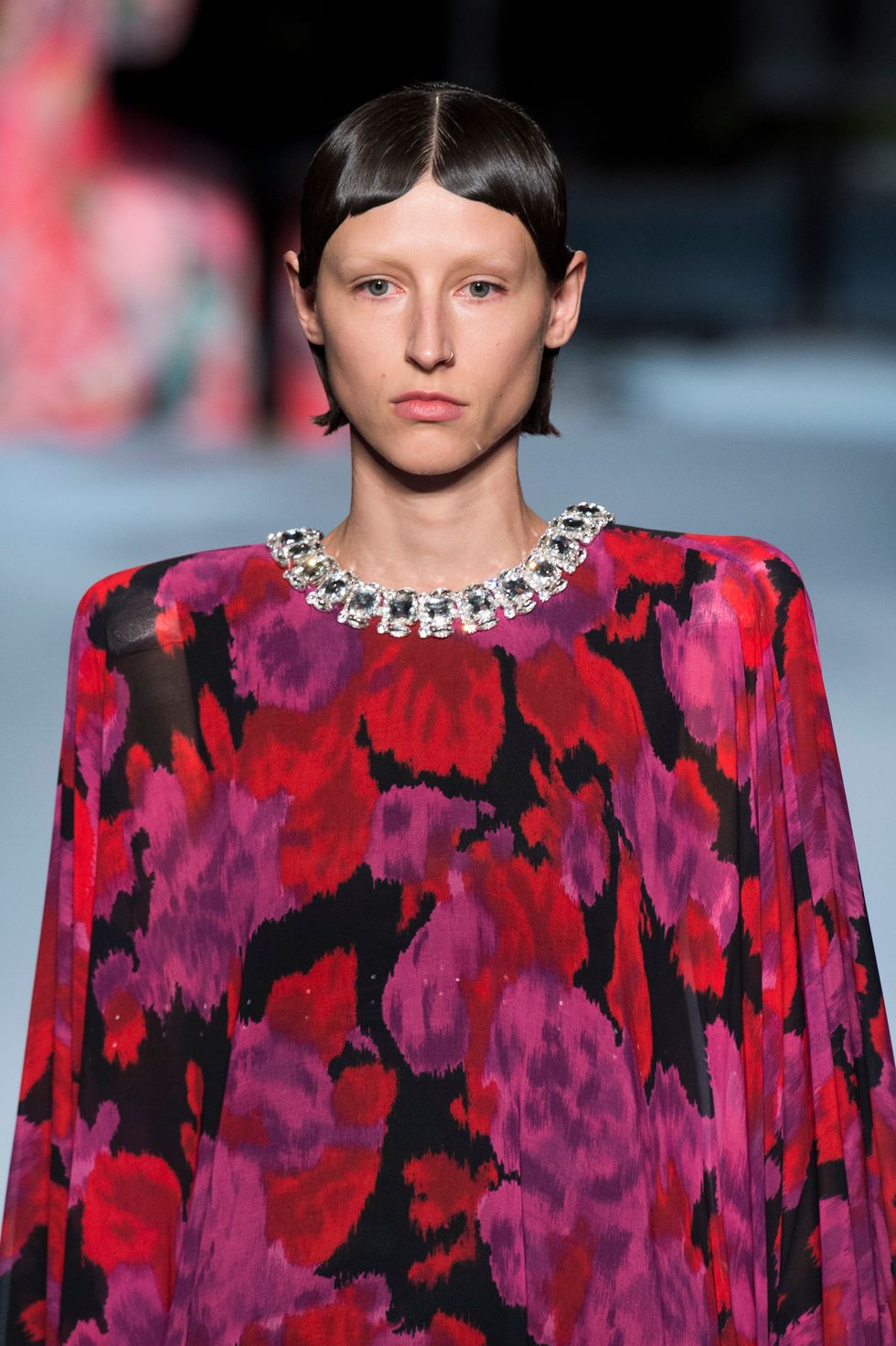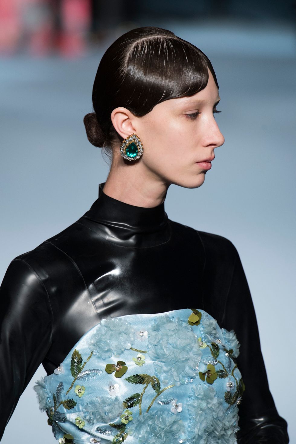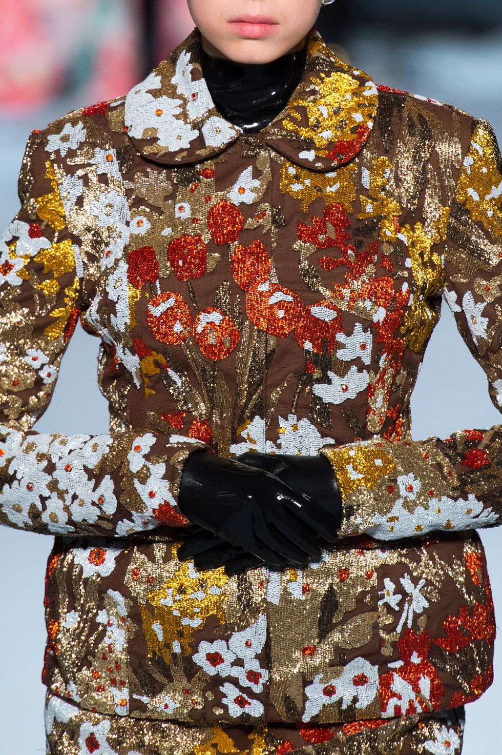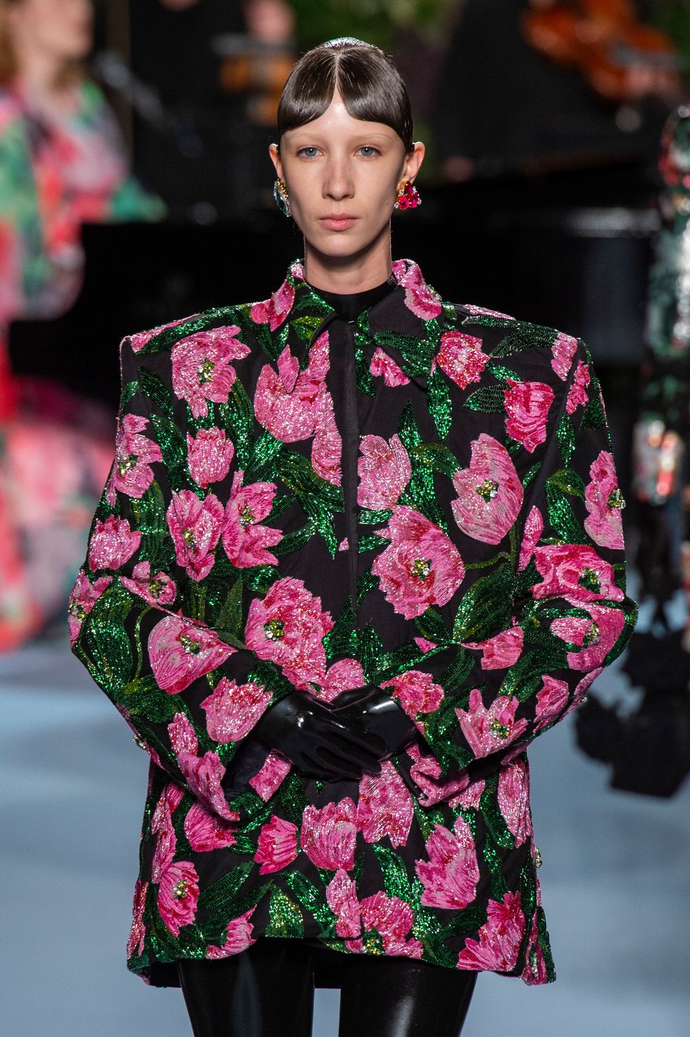 Many of the floral printed gown were layered over midnight black, super shiny latex bodysuits that went from toe to fingers. This gave the otherwise girlish looks an unconventional spin, while Freya Ridings played the piano and sang in the background.
