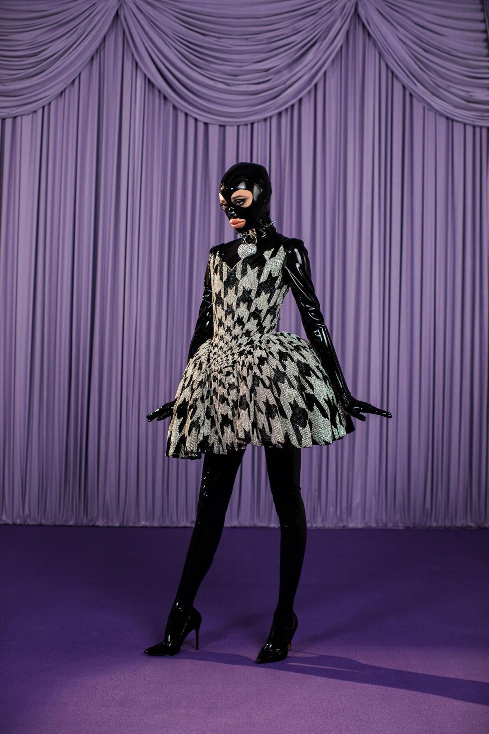 Drag Race UK fan-favorites (and fashion darlings) Bimini Bon Boulash and Tayce make a cameo in the SoHo portion of the film behind window storefronts, the former in a black latex getup and the latter in a structured evening look. Speaking of latex, the material was a recurring motif in Quinn's fetish-inspired video complete with whips and leather at every turn.