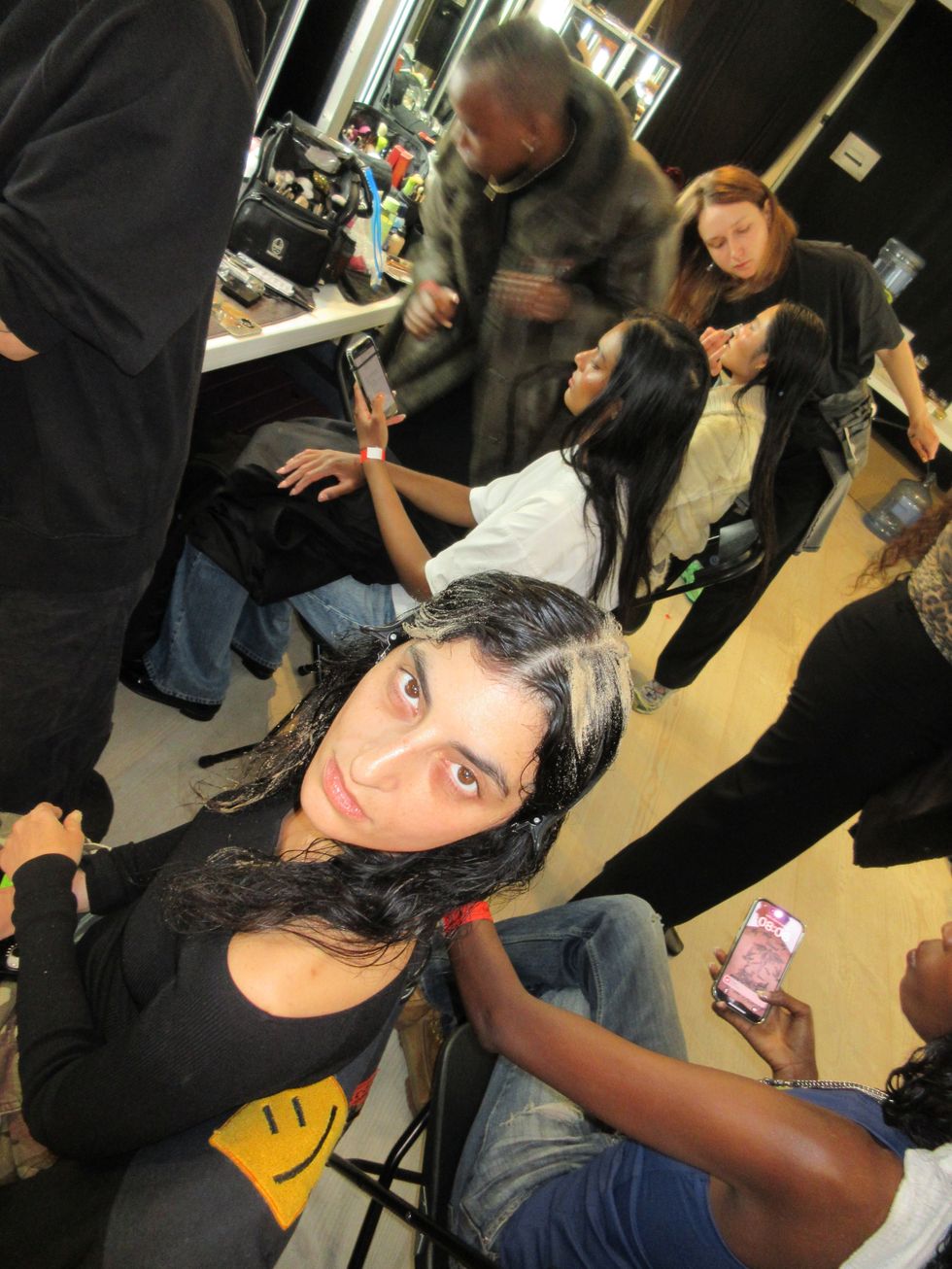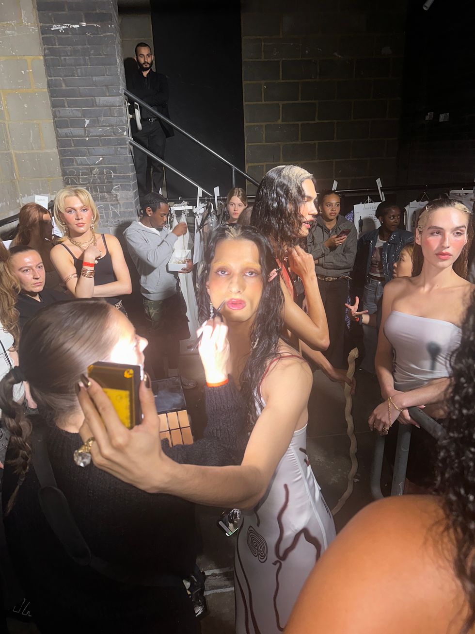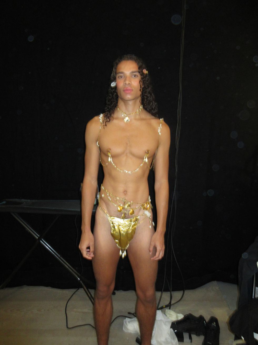 “‘My Body Is a Labyrinth’ invites us to embrace the parts of ourselves that have been hidden in the shadows,” Petsa’s notes continued, “Offering both release and redemption.” Indeed, her clothes looked powerful, with dresses swathed around hips and chests in beachy sunset pastels. One model carried a blazing torch wearing only a brief suspended by a long chain necklace. Richie Shazam also made a runway appearance, her fingers covered by sand and dripping in a dramatic cream dress — "steamy sexy vibes," as she described to PAPER.