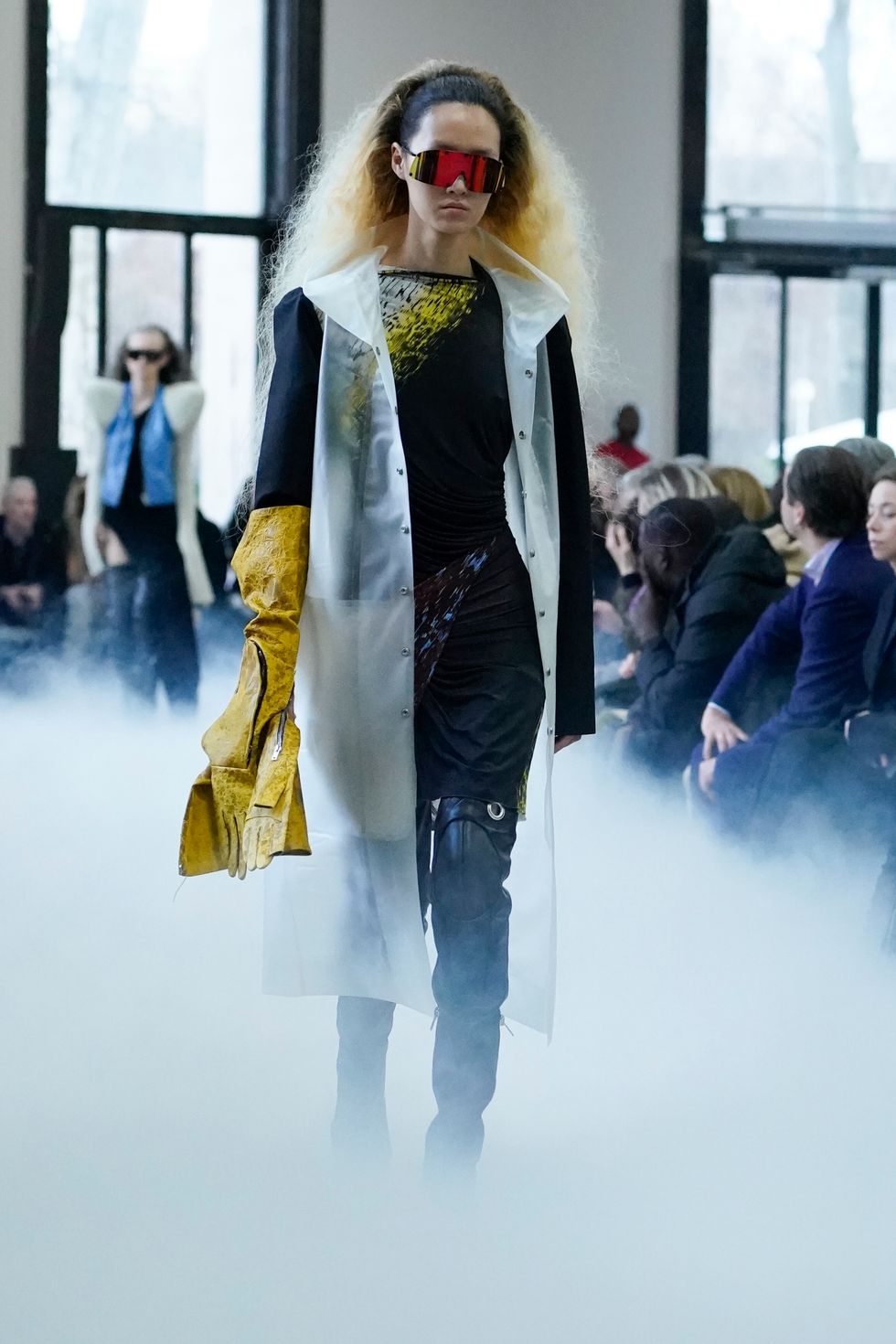 Owens' wife Michele Lamy carried the creepy head replica of the designer as she made her way to the front row. It appeared to be hung from a harness device that strapped onto Lamy so she could show off the piece hands-free.