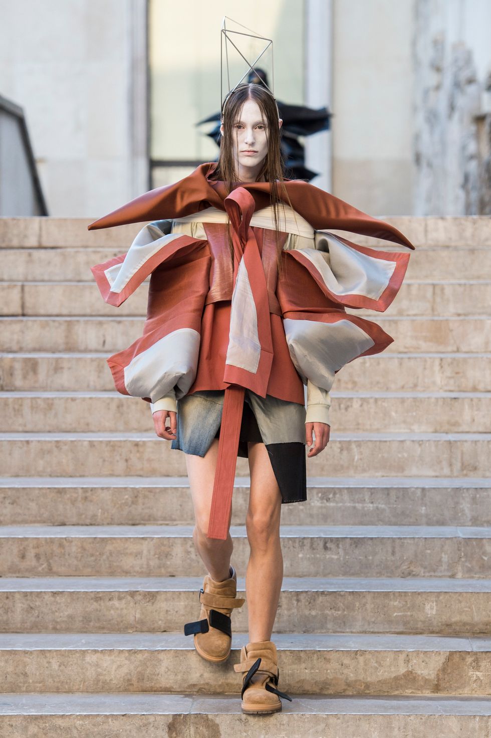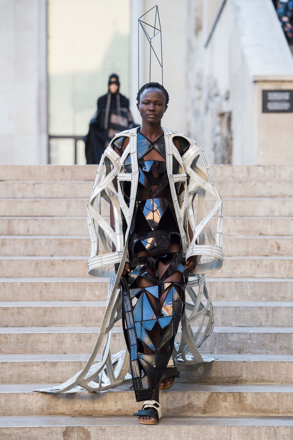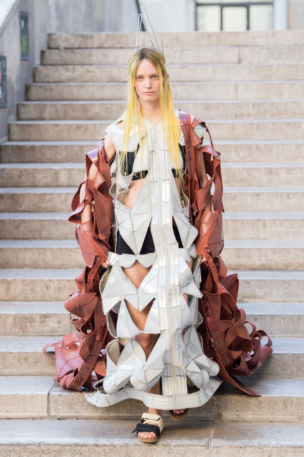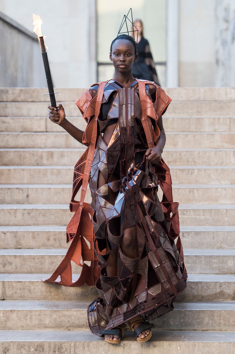 Rick Owens had a pyramid-shaped structure erected and set ablaze for his spring 2019 show at the Palais de Tokyo. The pyre alluded to the Tower of Babel — the ziggurat from the Biblical myth that seeks to explain the origins of different languages — and late Russian architect Vladimir Tatlin's model of a Constructivist tower that was never realized. It's a fitting anchor for Owens's show, as his collections are always brimming with primordial energy. Wearing cage-like arm braces and headpieces with lit torches in hand, models were transformed into high priestesses amid a pagan ritual.