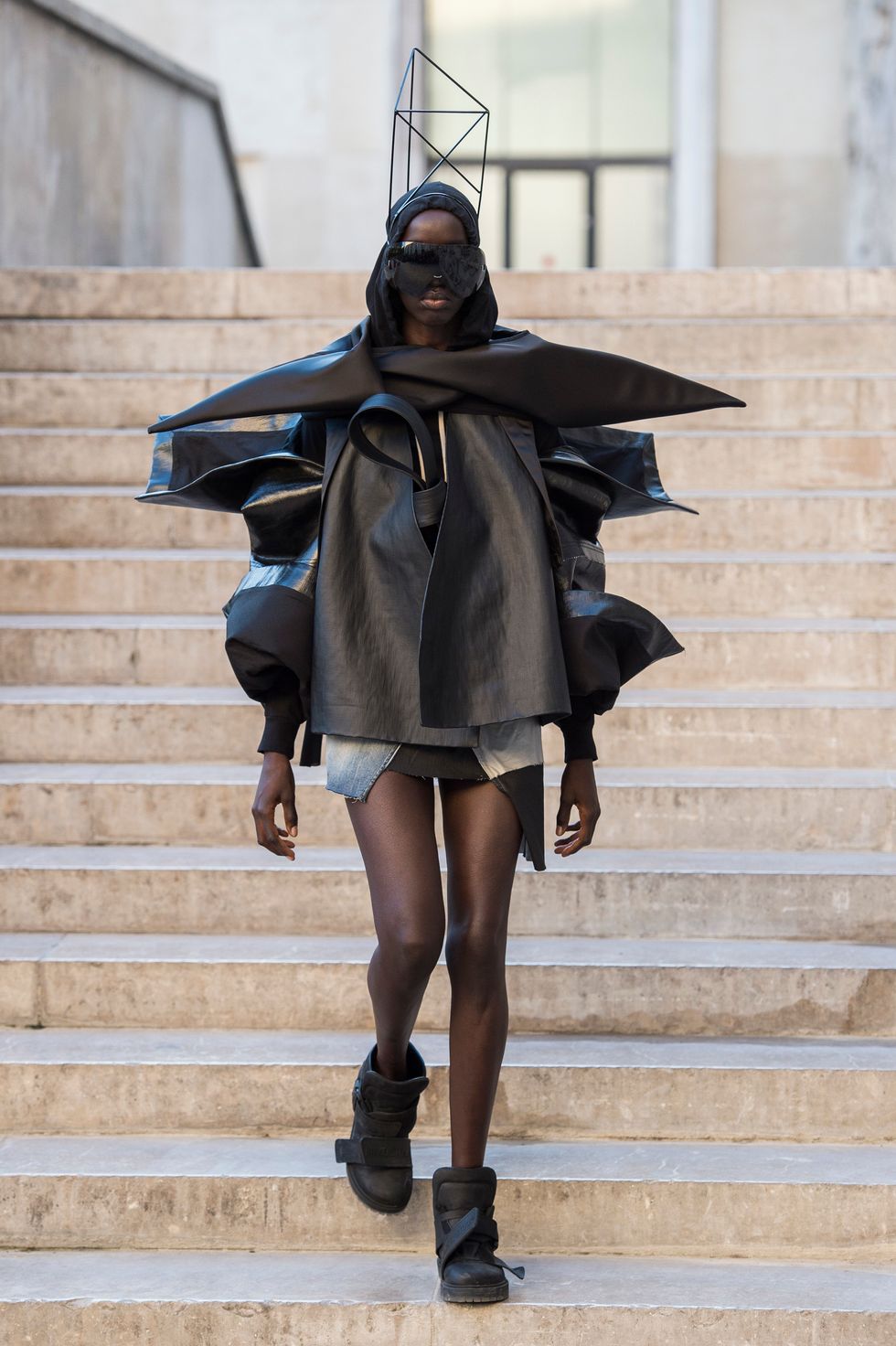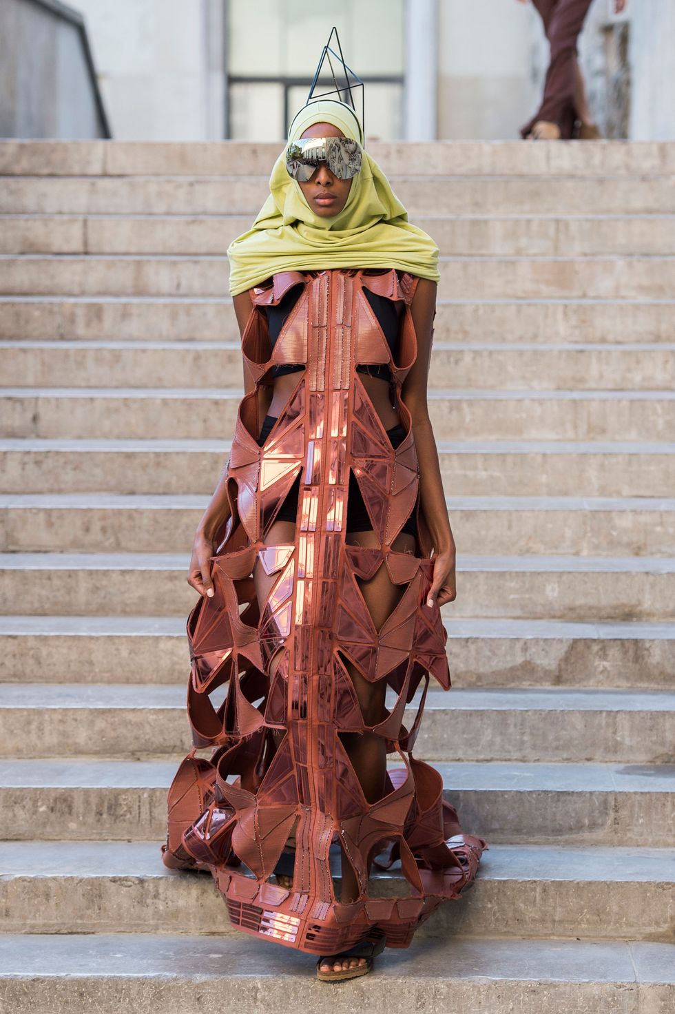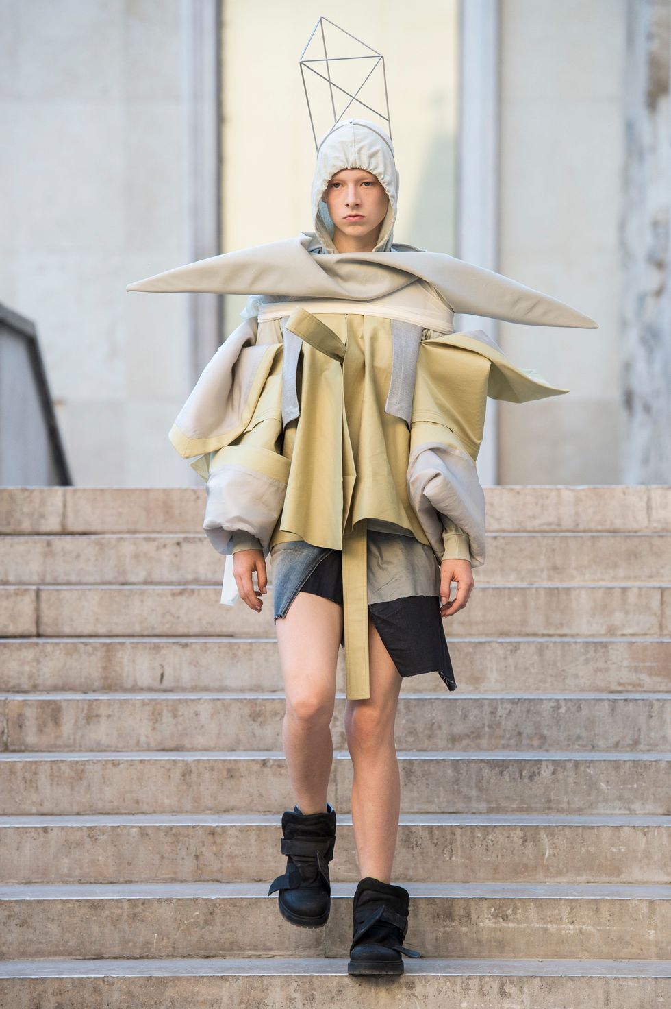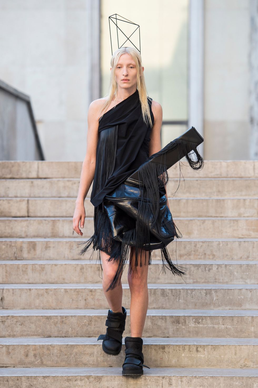 Rick Owens had a pyramid-shaped structure erected and set ablaze for his spring 2019 show at the Palais de Tokyo. The pyre alluded to the Tower of Babel — the ziggurat from the Biblical myth that seeks to explain the origins of different languages — and late Russian architect Vladimir Tatlin's model of a Constructivist tower that was never realized. It's a fitting anchor for Owens's show, as his collections are always brimming with primordial energy. Wearing cage-like arm braces and headpieces with lit torches in hand, models were transformed into high priestesses amid a pagan ritual.