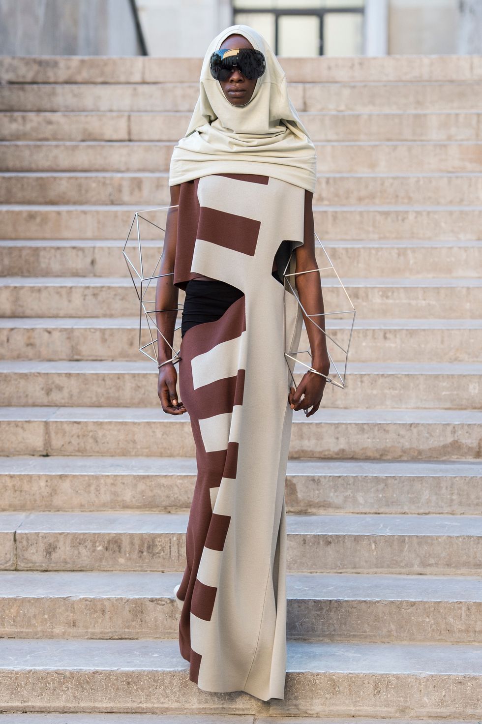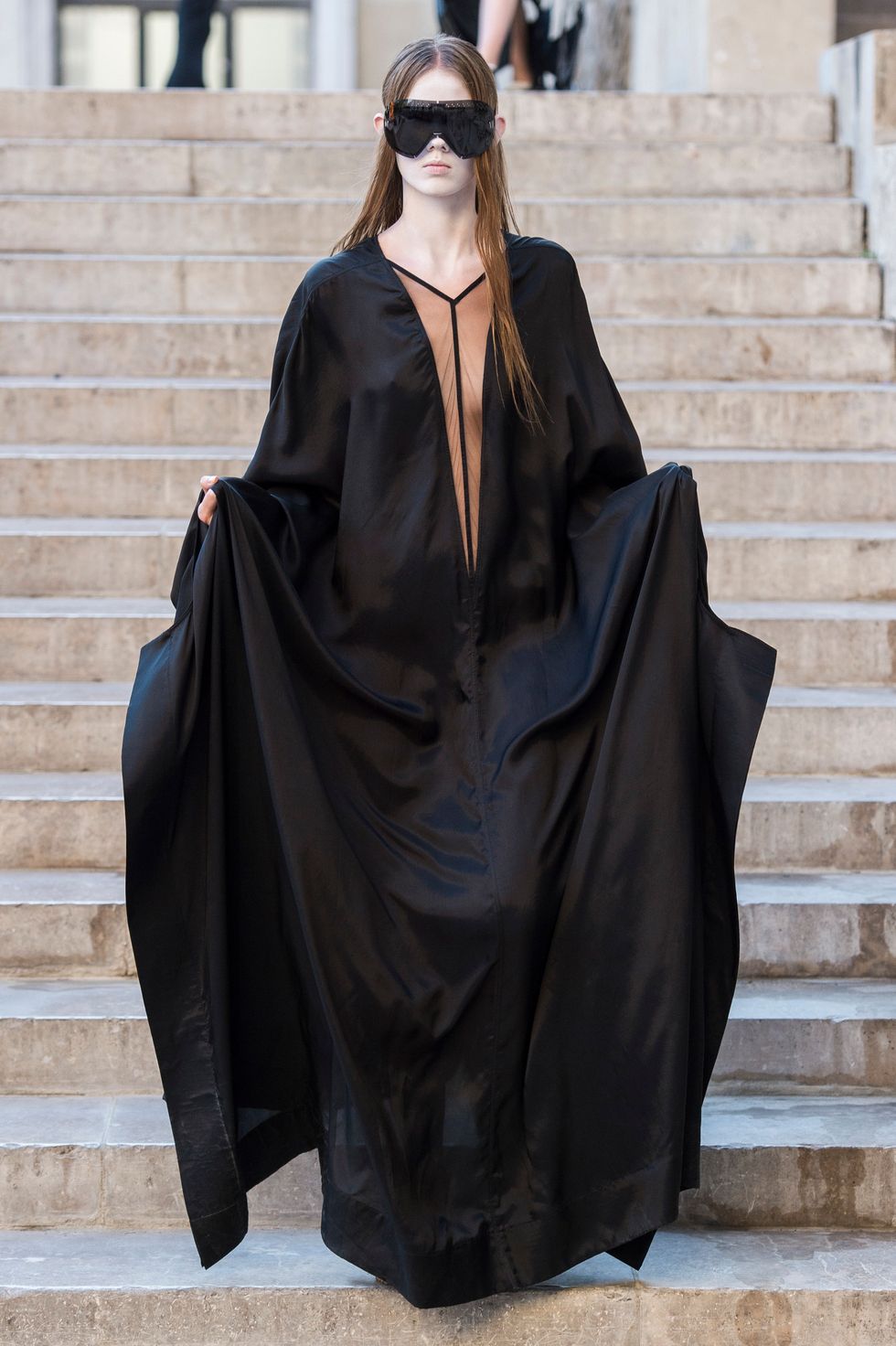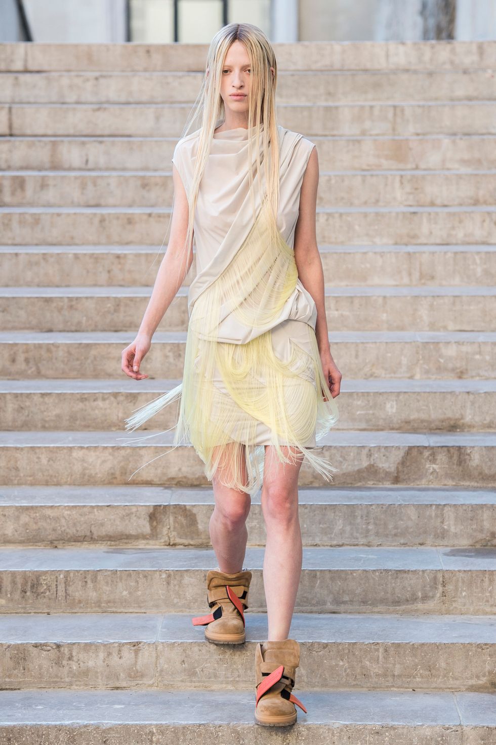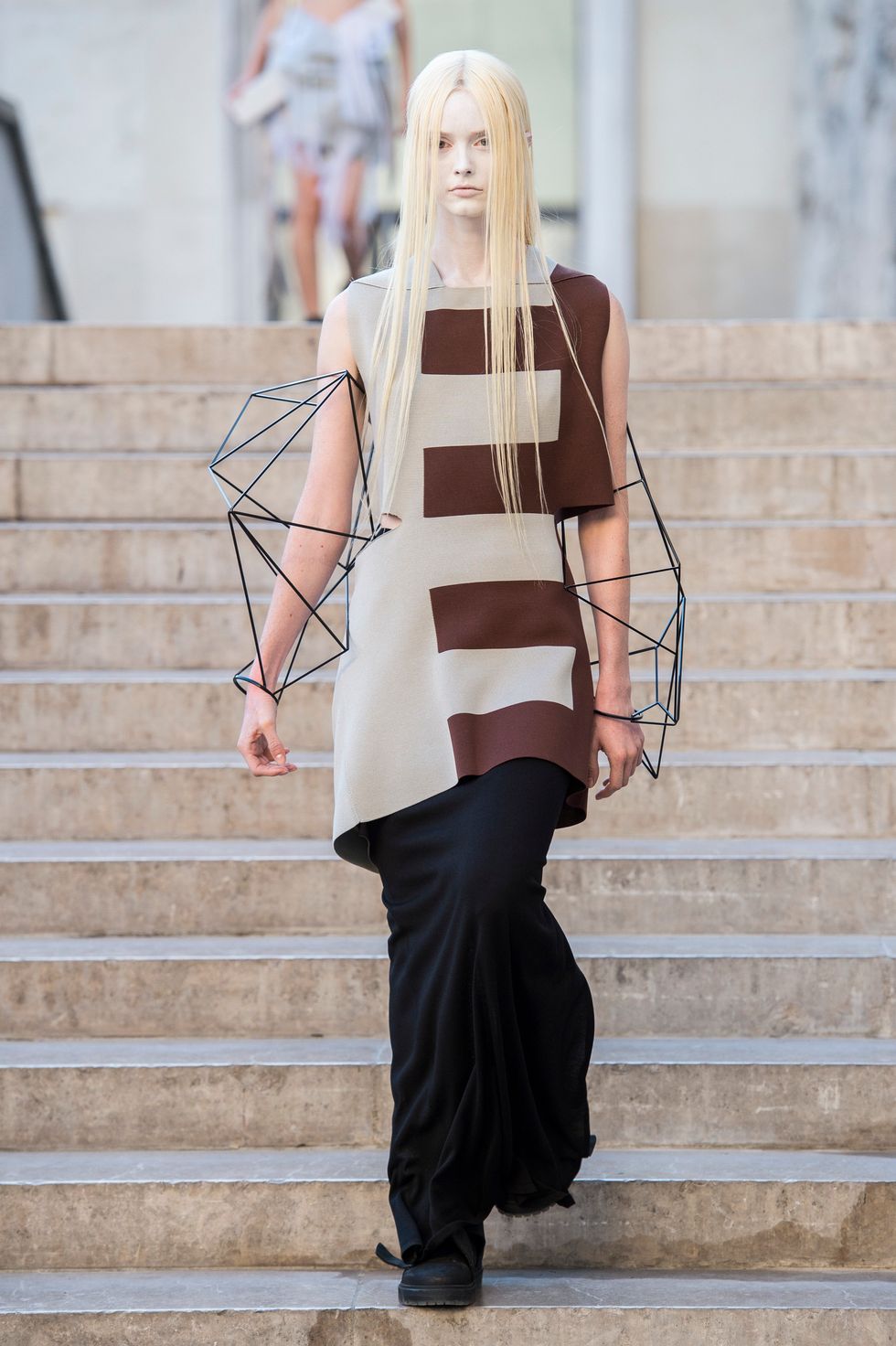 Rick Owens had a pyramid-shaped structure erected and set ablaze for his spring 2019 show at the Palais de Tokyo. The pyre alluded to the Tower of Babel — the ziggurat from the Biblical myth that seeks to explain the origins of different languages — and late Russian architect Vladimir Tatlin's model of a Constructivist tower that was never realized. It's a fitting anchor for Owens's show, as his collections are always brimming with primordial energy. Wearing cage-like arm braces and headpieces with lit torches in hand, models were transformed into high priestesses amid a pagan ritual.