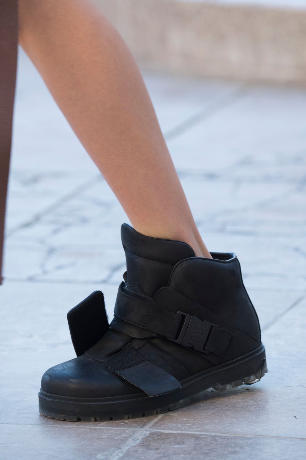 The brand's longstanding partnership with German footwear brand Birkenstock manifested as logo emblazoned hiking boots this season. The utilitarian style was puffed up and fitted with oversized straps for the women Owens describes as, "mountain witches."