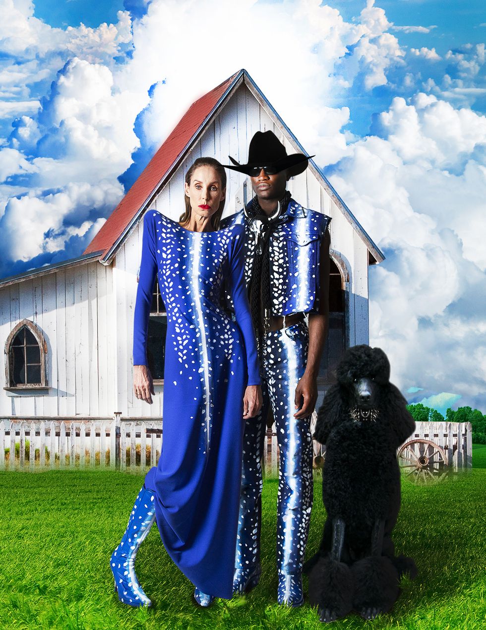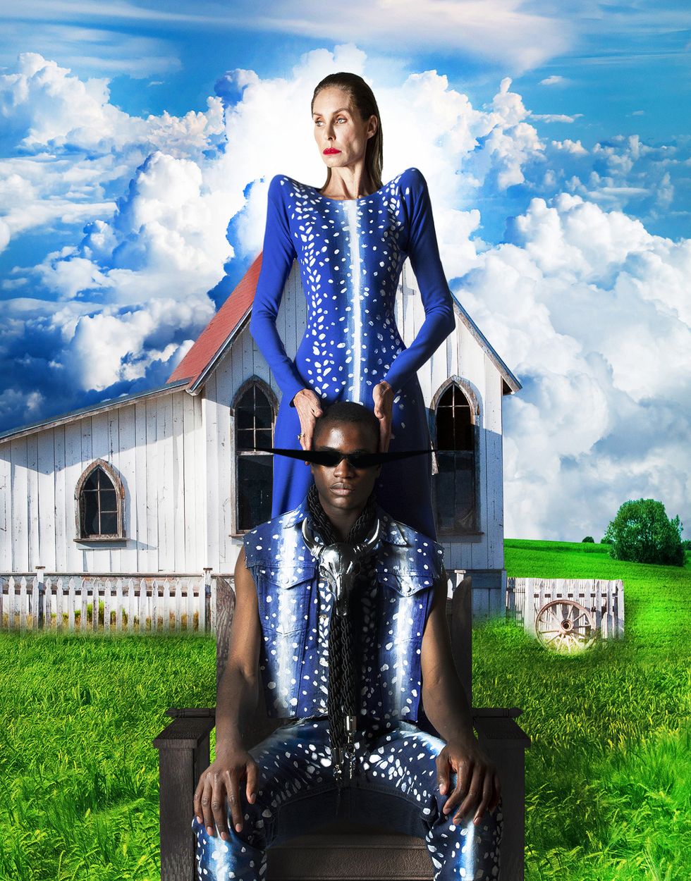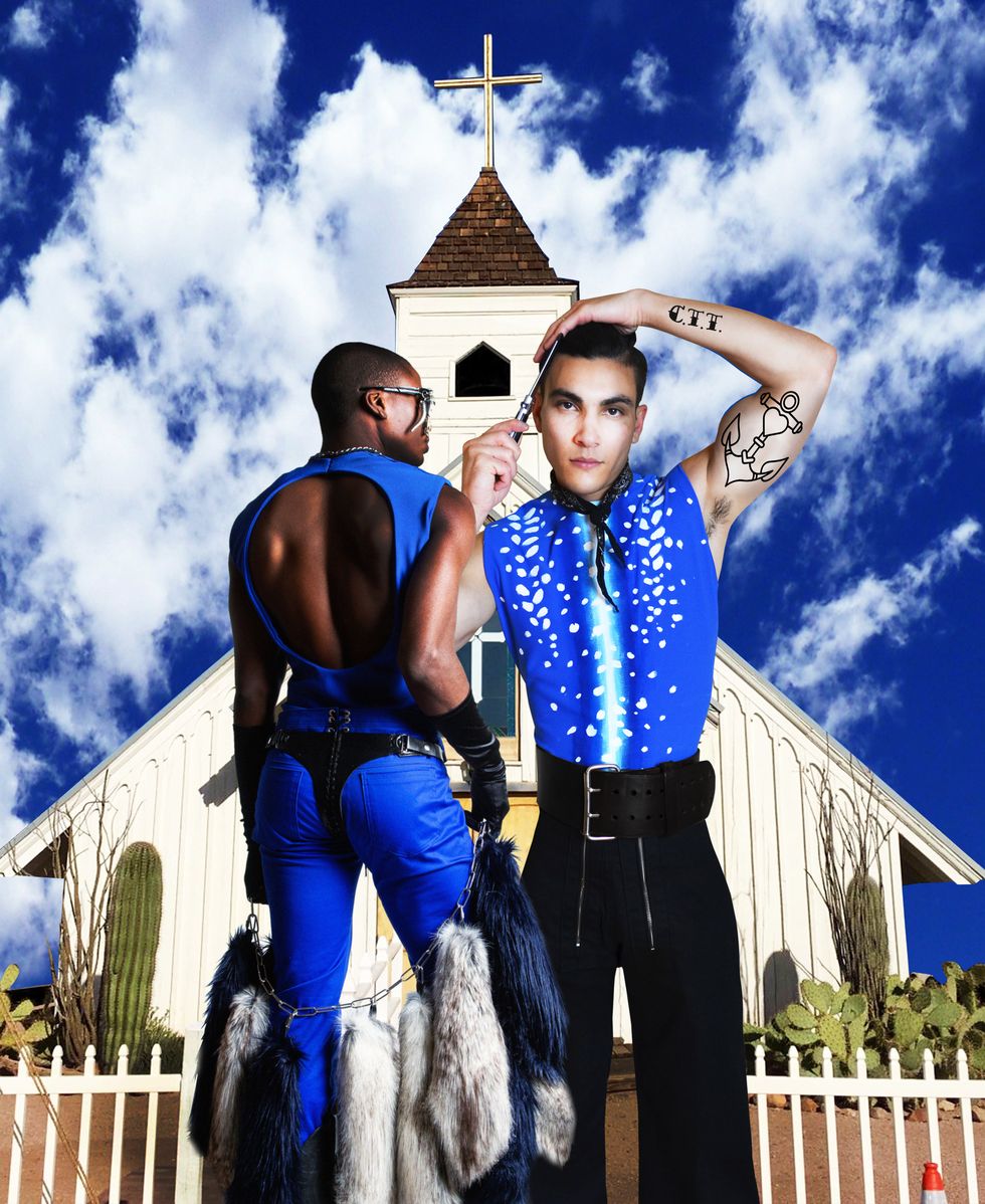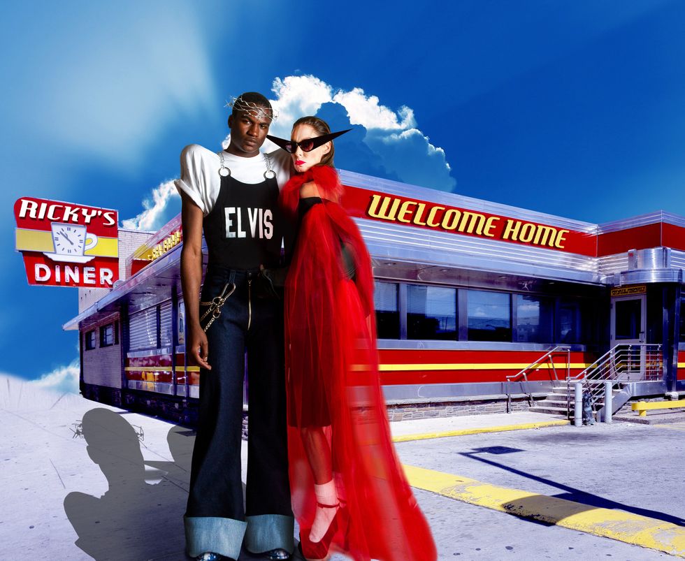 He created a series of collages that feature his clothes against open-air landscapes and surreal all-American scenarios. "I drew inspiration from some of my favorite artists like David LaChapelle, Pierre et Gilles, John Waters, and Michael the III," Ross says. "I've been developing a style of digital collage for years, and this project feels like a true culmination of all my creative skills."