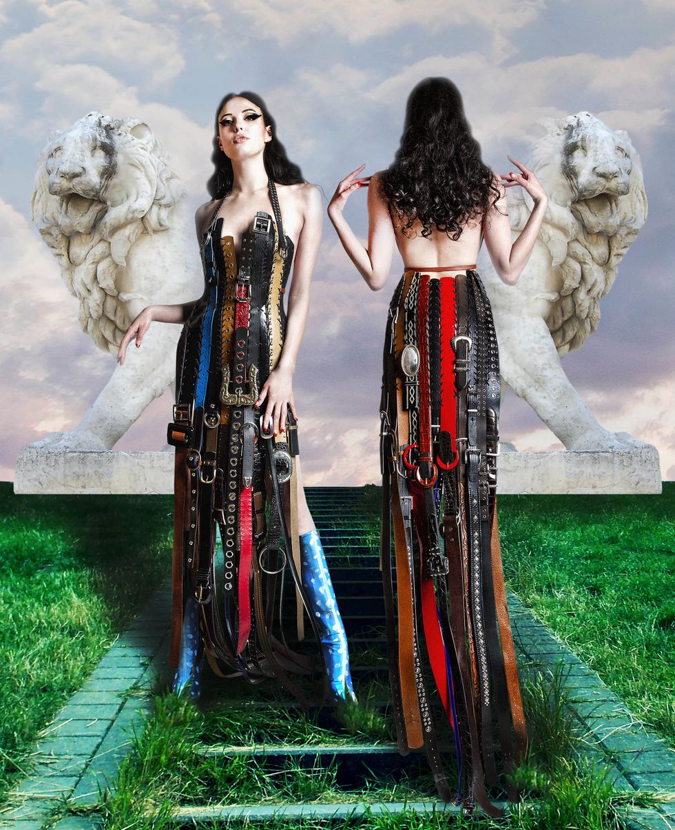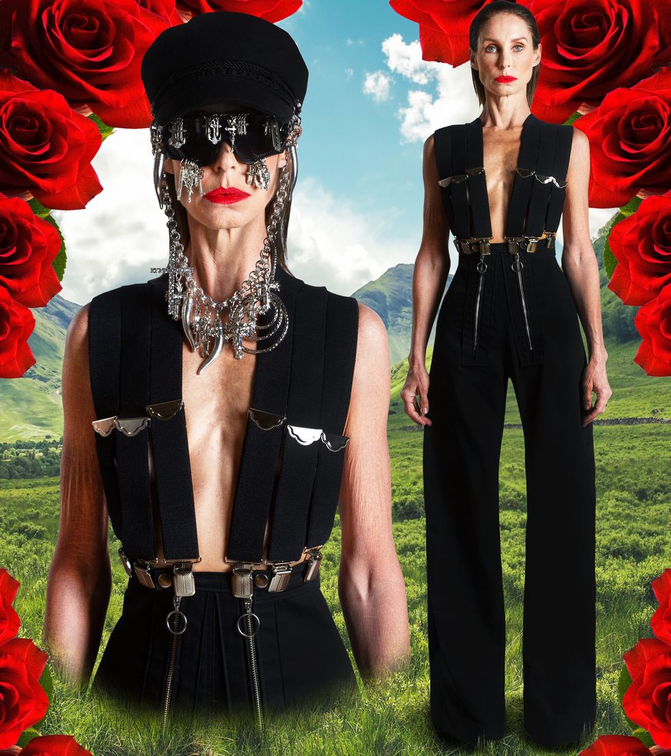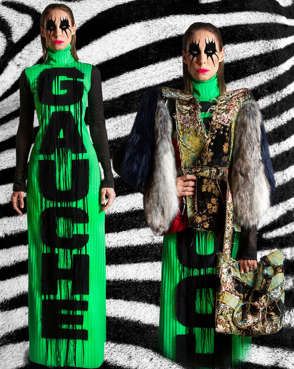 The collection features Ricky King's patchwork "gauche" pieces, including a gown made from 30 belts, hand-painted "antelope" print pieces, '50s "diner" looks inspired by Johnny Depp and Traci Lords in Cry-Baby, and the chain link faux fur tail stole.