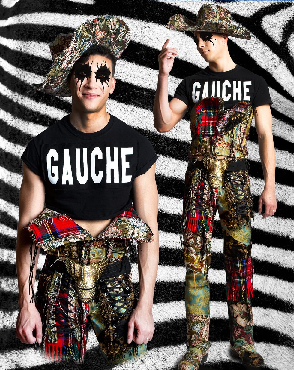 The effort quickly led to another big break on the set of Lady Gaga's 2017 "John Wayne" video, where she donned a bustier made from old cowboy boots. "Seeing my cowboy boot bustier in action on Gaga in the 'John Wayne' video was amazing, and I knew I wanted to bring in another piece made from cowboy boots for this collection, so I ended up making a codpiece/thong — fully impractical and fully fabulous," Ross tells PAPER.