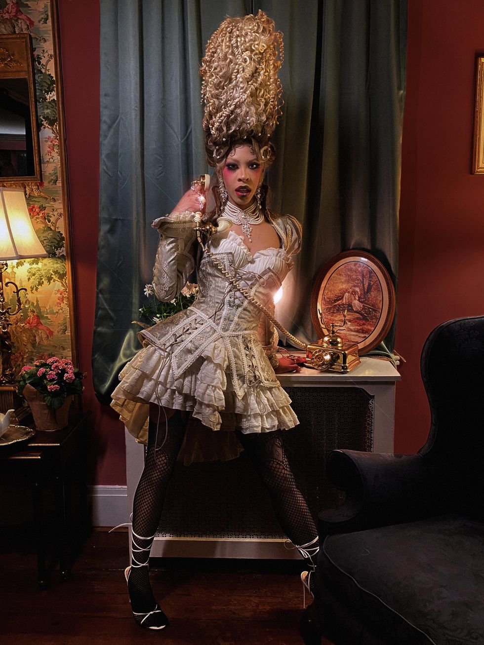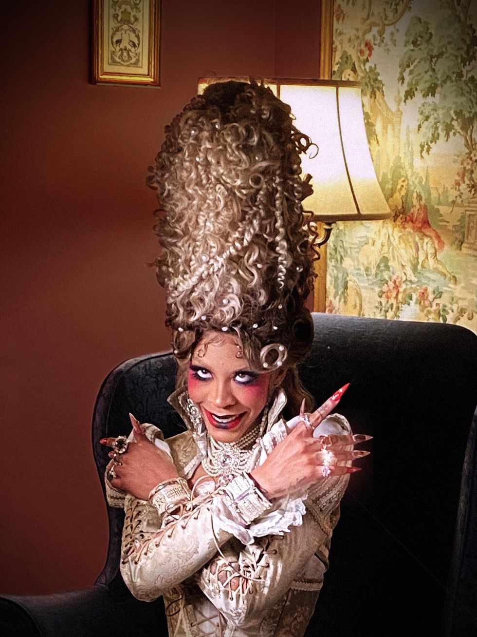 Rico Nasty's hair stylist Preston Wada helped transform her into France's iconic, ill-fated queen. "As soon as we decided on the creative treatment, I was excited to push the look as far as possible," he tells PAPER. "I knew this hair moment had to be bigger and better than anything we had created yet. Rico always lets me play; she's such an amazing artist and collaborator. We get each other creatively, so she let me run with it."