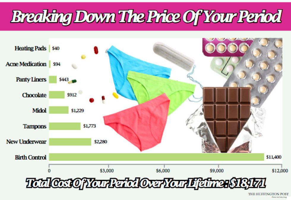 Both studies acknowledge that pads and tampons are only the beginning. Huffington Post estimated that when you look holistically at what women and menstruators purchase in order to make their periods livable and socially acceptable, including heating pads, acne medication, panty liners, Midol, replaced underwear, birth control and chocolate, the total cost of a period over a lifetime can be as high as $18,171.