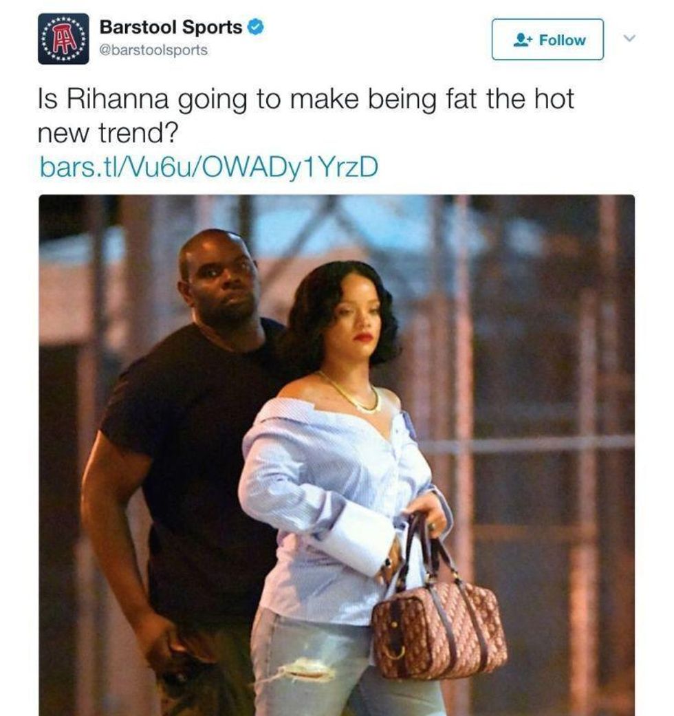 While there was a whole heap of support from the Navy, a certified bro over at sports site Barstool found the recent images of Rihanna personally insulting and mused whether the singer was about to start a whole "trend" of fat women, just in time for summer. Can you imagine? Just in time for summer?