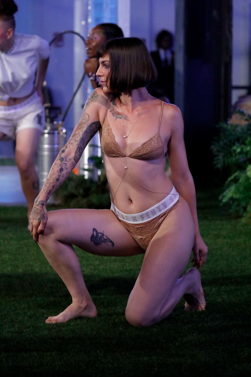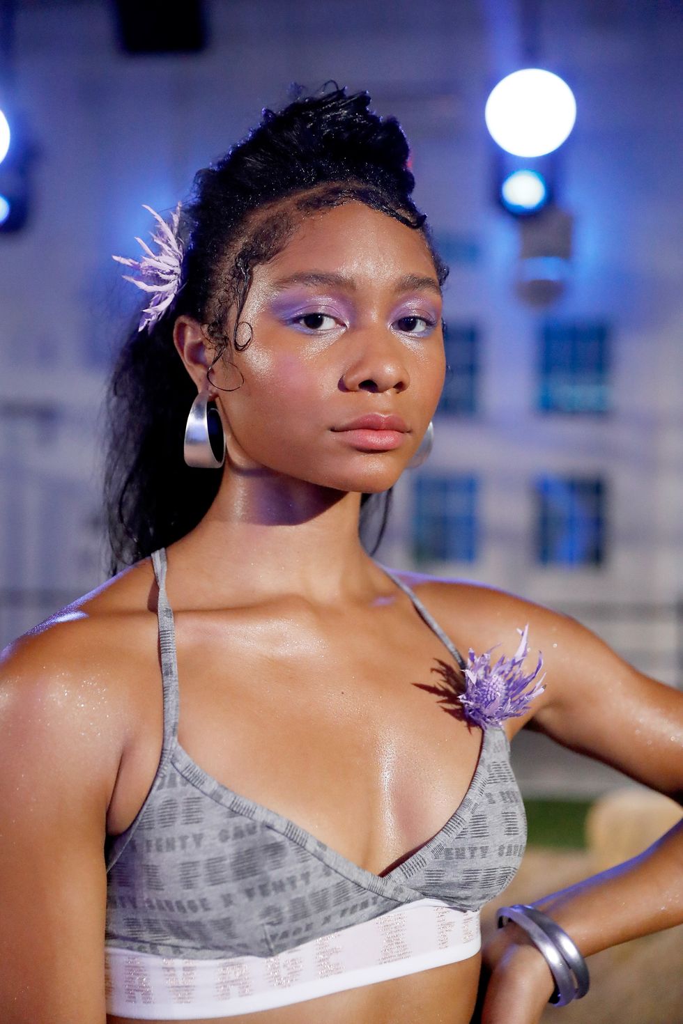 True to Rihanna's mission as first stated (and realized) with her Fenty Beauty line, the show boasted a diverse range of models rarely seen in a major runway show. The singer continued to use her star power to put forth a vision of a world where women's bodies are celebrated and free, rather than maligned and controlled. The runway show itself operated within the rule of threes, beginning with a troupe of models marching out in Fenty's signature nude tone pieces, their bodies adorned with flowers, leaves and branches. The shiny, neon and iridescent looks were next, followed by more classic femme fatale get ups, including silky, sheer robes and animal-print panties. Elbow length gloves, exaggerated baby hairs, furry slides, tiny sunglasses and feather trimmed accessories added a playful edge. Familiar faces like Bella and Gigi Hadid and Joan Smalls appeared alongside newer names.