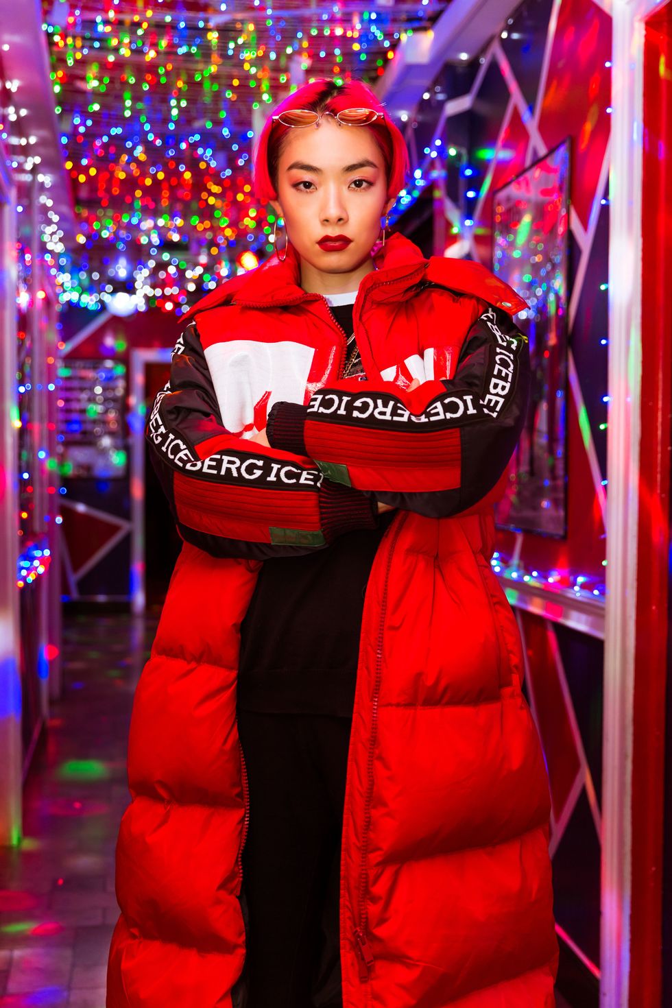 Minutes later, Sawayama is standing atop her seat, one chunky white Buffalo sneaker (the brand immortalized by Baby Spice in the '90s) perched on the table as she strikes pose after pose for our photographer. Multi-colored disco lights dance across her face in a kaleidoscopic rainbow, her cherry red hair swishing side to side as she moves effortlessly around our small shared space, dancing to "Can't Get You Out of My Head." It's almost like watching a glossy music video being filmed in real time, but I shouldn't be surprised: This girl lives and breathes pop.