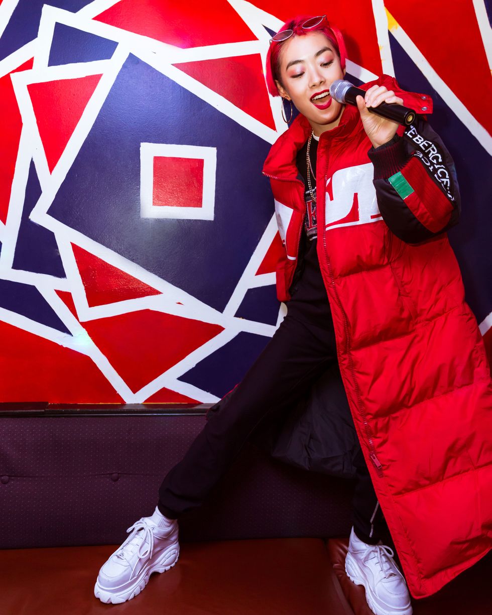 Rina Sawayama is curled up on a red vinyl booth, her knees pulled up to her chin. With a worn microphone in one hand, a fizzy soju cocktail in the other, she casually sings along to "Come Into My World," her eyes fixated on the yellow lyrics as they flash across the TV screen in the corner of our private karaoke room. It's apparent from the way she lit up when I first selected the track from the thick song book on the beer-stained table in front of us that she's more than familiar with the 2002 bop. In fact, this won't be the only time Kylie Minogue will pop up during our hour and a half spent together.