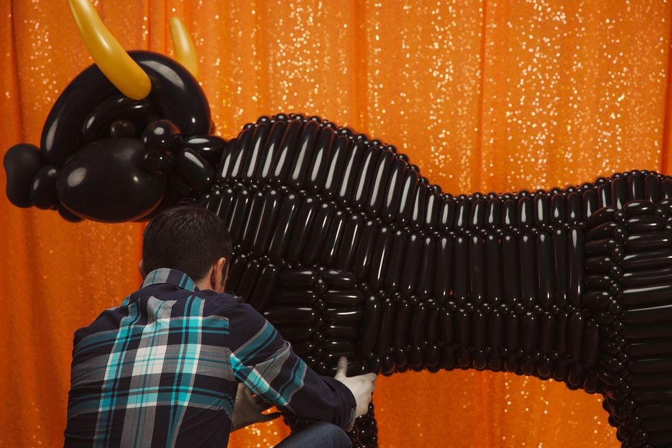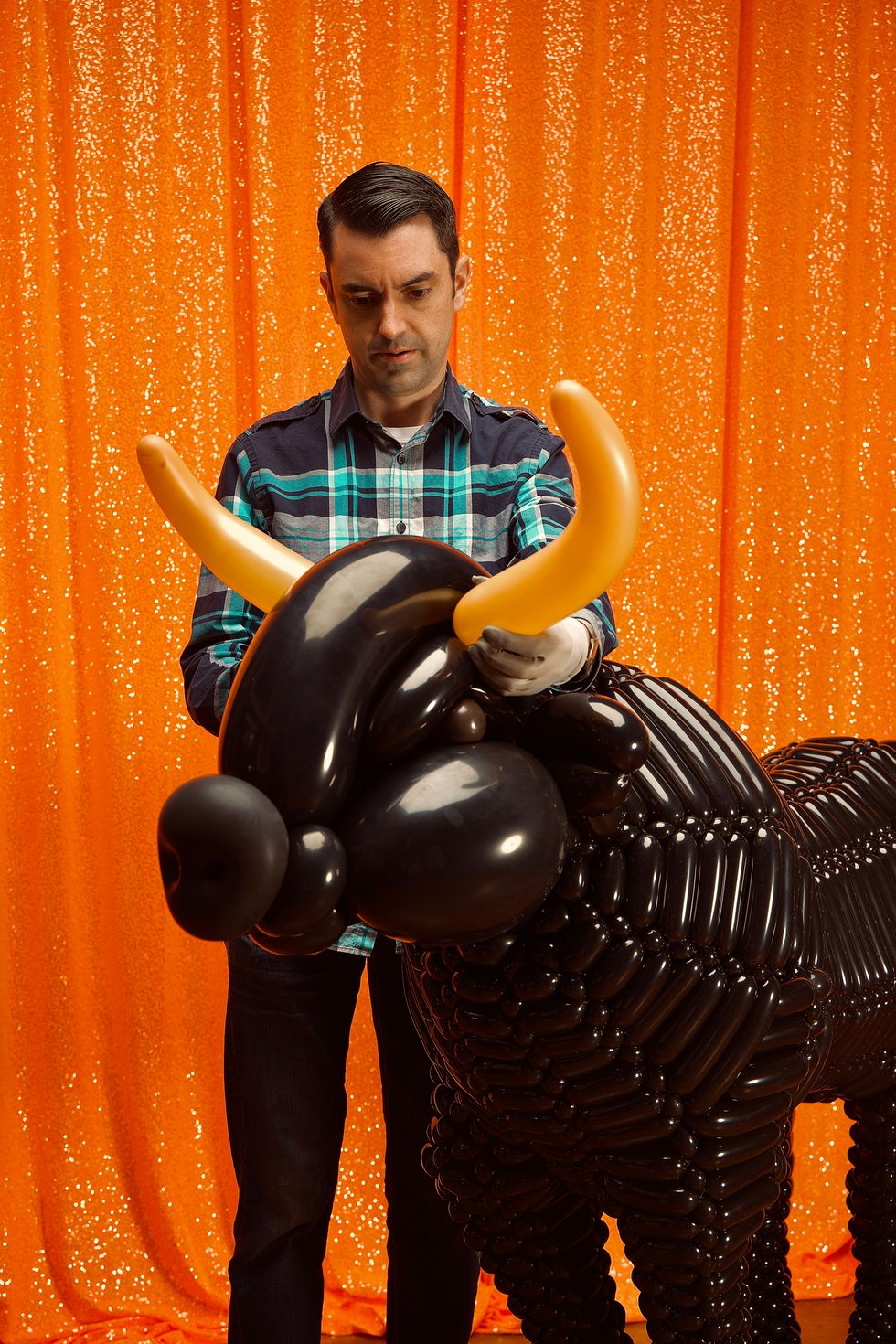 Enter Rob Balchunas, also known as "Rob The Balloon Guy" — a balloon artist in the truest sense of the phrase. Balchunas spent about 15 hours constructing the balloon bull for our cover shoot, working from reference photos to create a "weave" form capable of staying together under Peck's weight.