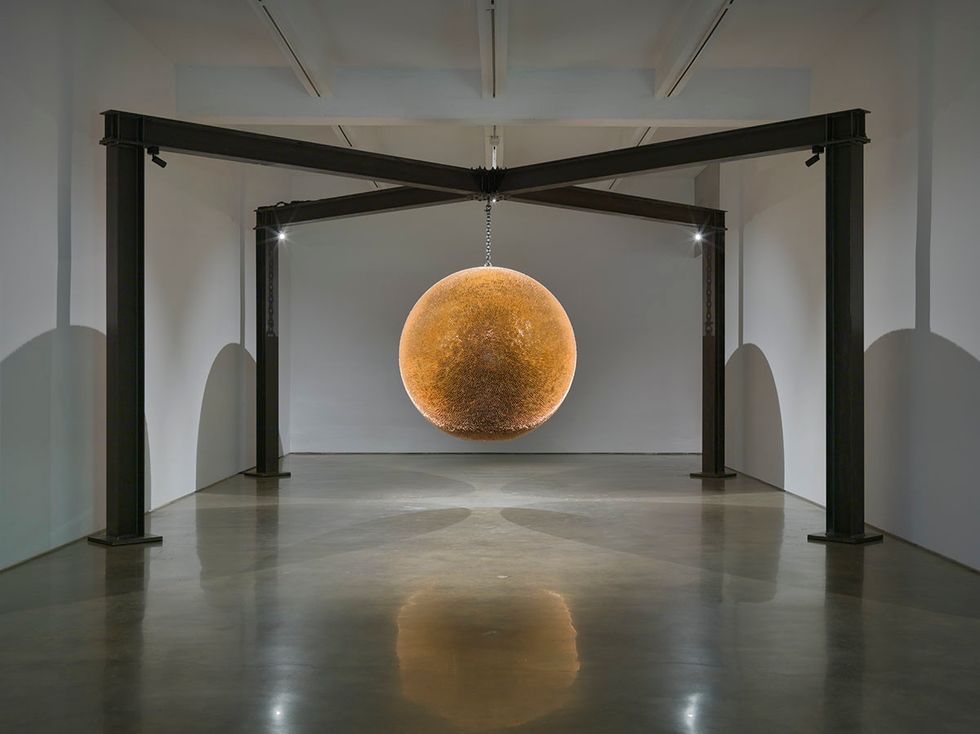 Robert Longo, Death Star 2018, 2018approximately 40,000 inert bullets (brass, copper, lead) welded to the frame; steel I-beams; steel chain254 1/2 x 254 1/2 x 144 inches (overall)646.4 x 646.4 x 365.8 cm77 inches (sphere diameter), 195.6 cmInstallation view, Metro Pictures, New York, 2019. Courtesy of the artist and Metro Pictures, New York.
