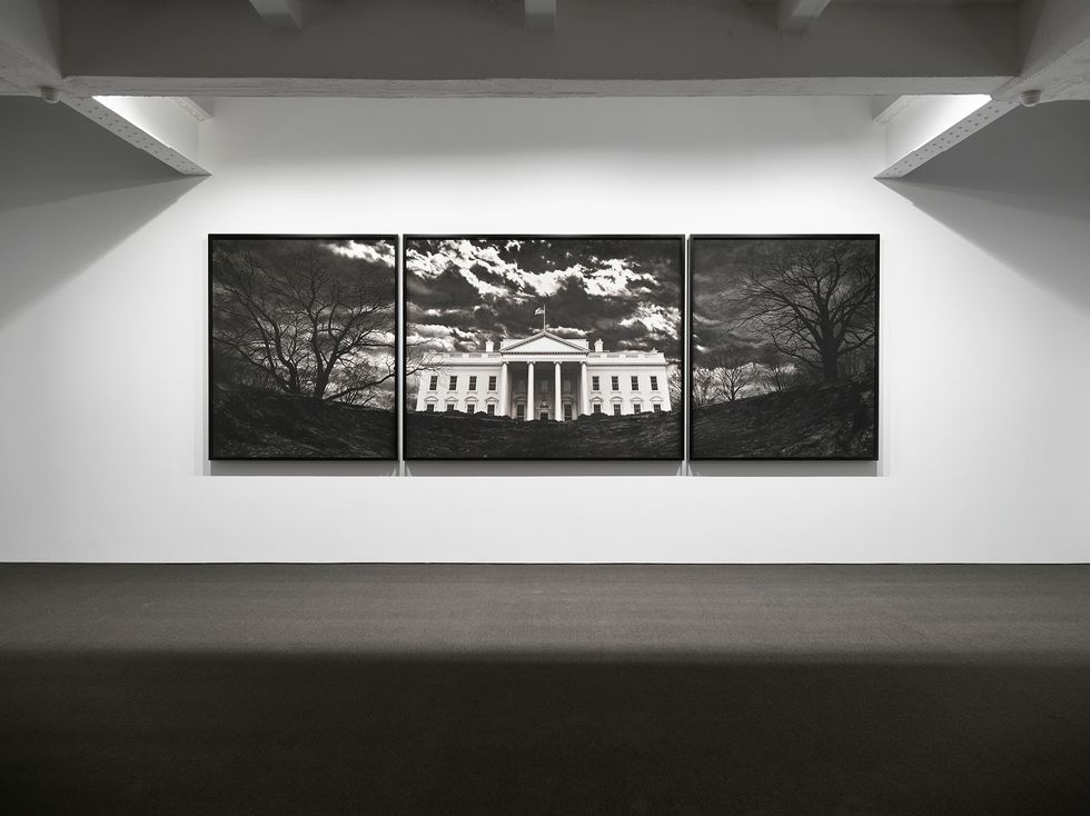 Robert Longo, Untitled (White House), 2019charcoal on mounted paper96 x 280 inches (overall image), 243.8 x 711.2 cm Installation view, Metro Pictures, New York, 2019. Courtesy of the artist and Metro Pictures, New York.