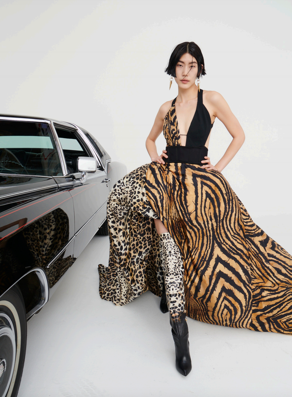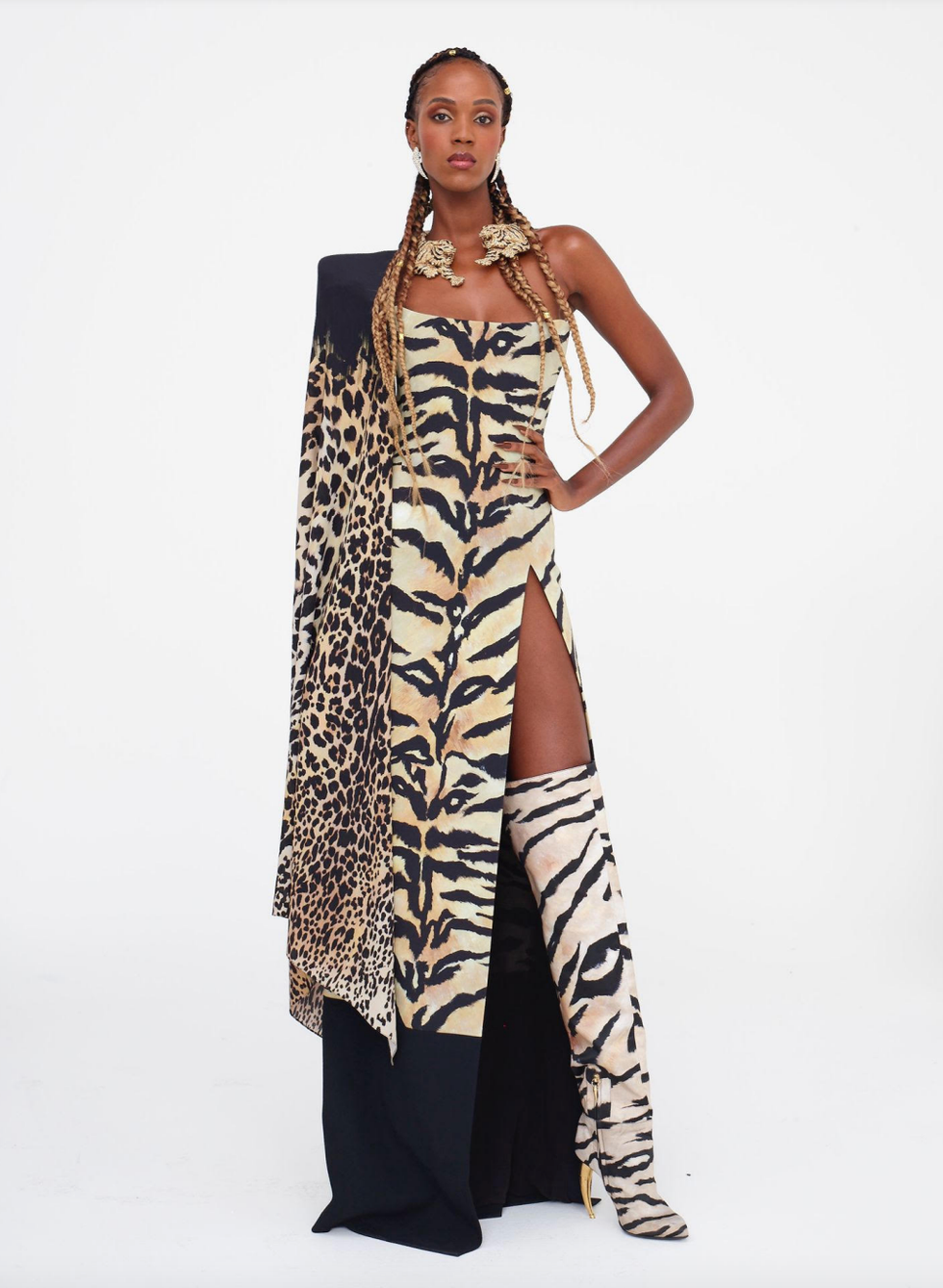 "The times have changed, you can't be blind," Puglisi told PAPER in a preview of the collection over Zoom. "I want it to be very focused on what's going on now in the world." In keeping with the fresh start, the brand's first Instagram post after wiping everything clean this month is a flag with tiger stripes and jaguar spots (a nod to the founder's penchant for animal prints) with the caption, "United States of Cavalli."