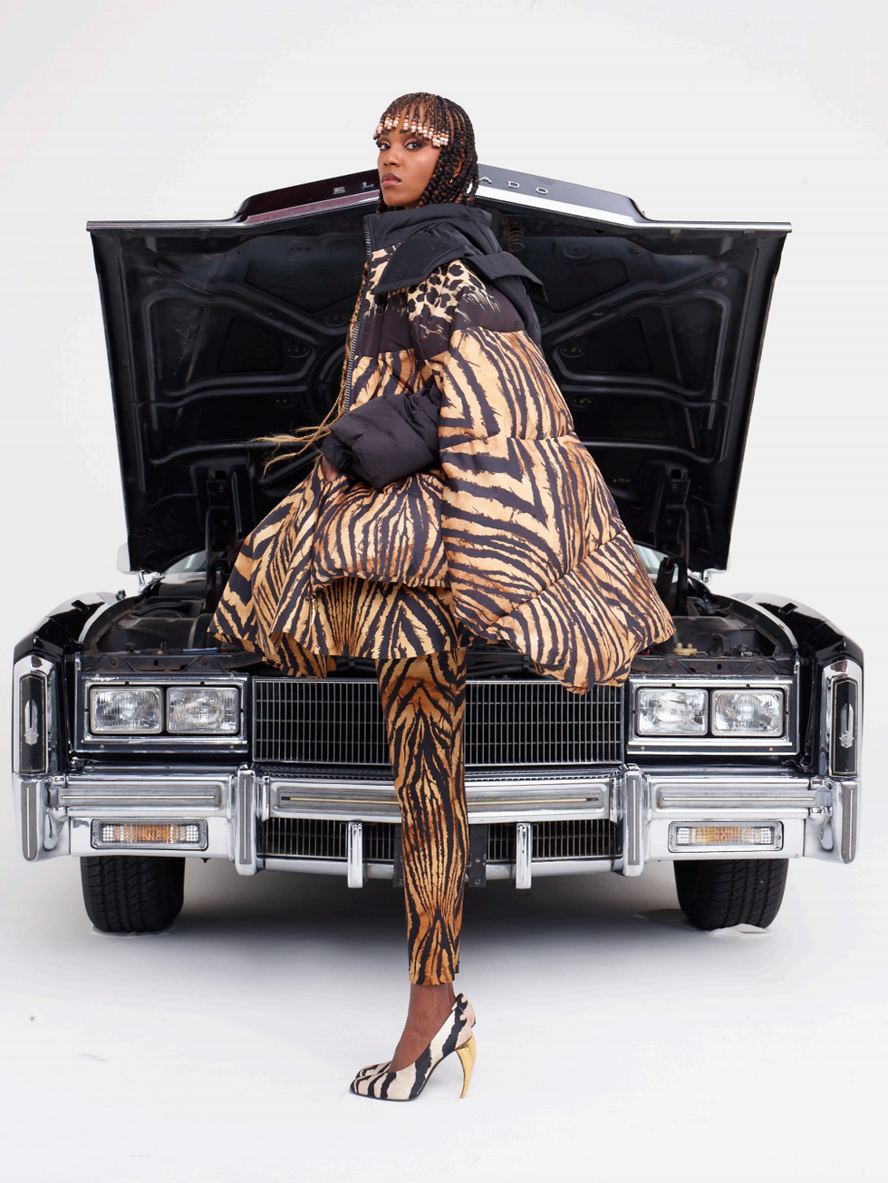 Indeed, the animal prints Cavalli is associated with — zebras, jaguars, tigers — are blown up and exaggerated in bold patchwork collages and trompe l'oeill-effect jacquards. Giant animal-shaped fangs and claws are used as the heels in footwear and as clasps in leather clutches. Elsewhere, there's an emphasis on daywear and more casual elements like puffers, sweatshirts and denim, all rendered in the Cavalli prints.