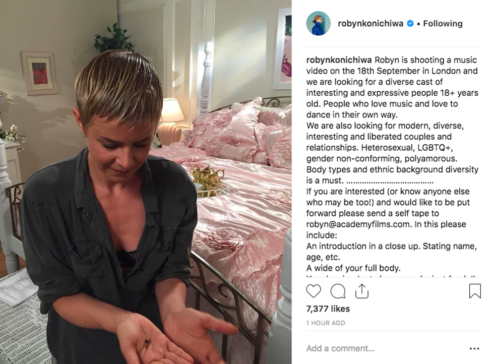 "Robyn is shooting a music video on the 18th September in London and we are looking for a diverse cast of interesting and expressive people 18+ years old. People who love music and love to dance in their own way. We are also looking for modern, diverse, interesting and liberated couples and relationships. Heterosexual, LGBTQ+, gender non-conforming, polyamorous. Body types and ethnic background diversity is a must. ………………………………… If you are interested (or know anyone else who may be too!) and would like to be put forward please send a self tape to robyn@academyfilms.com. In this please include:
