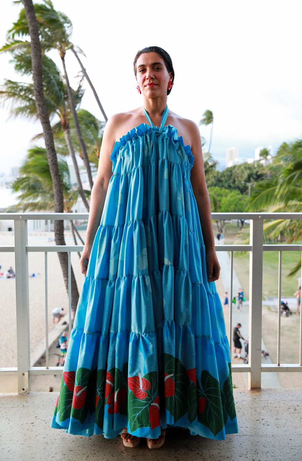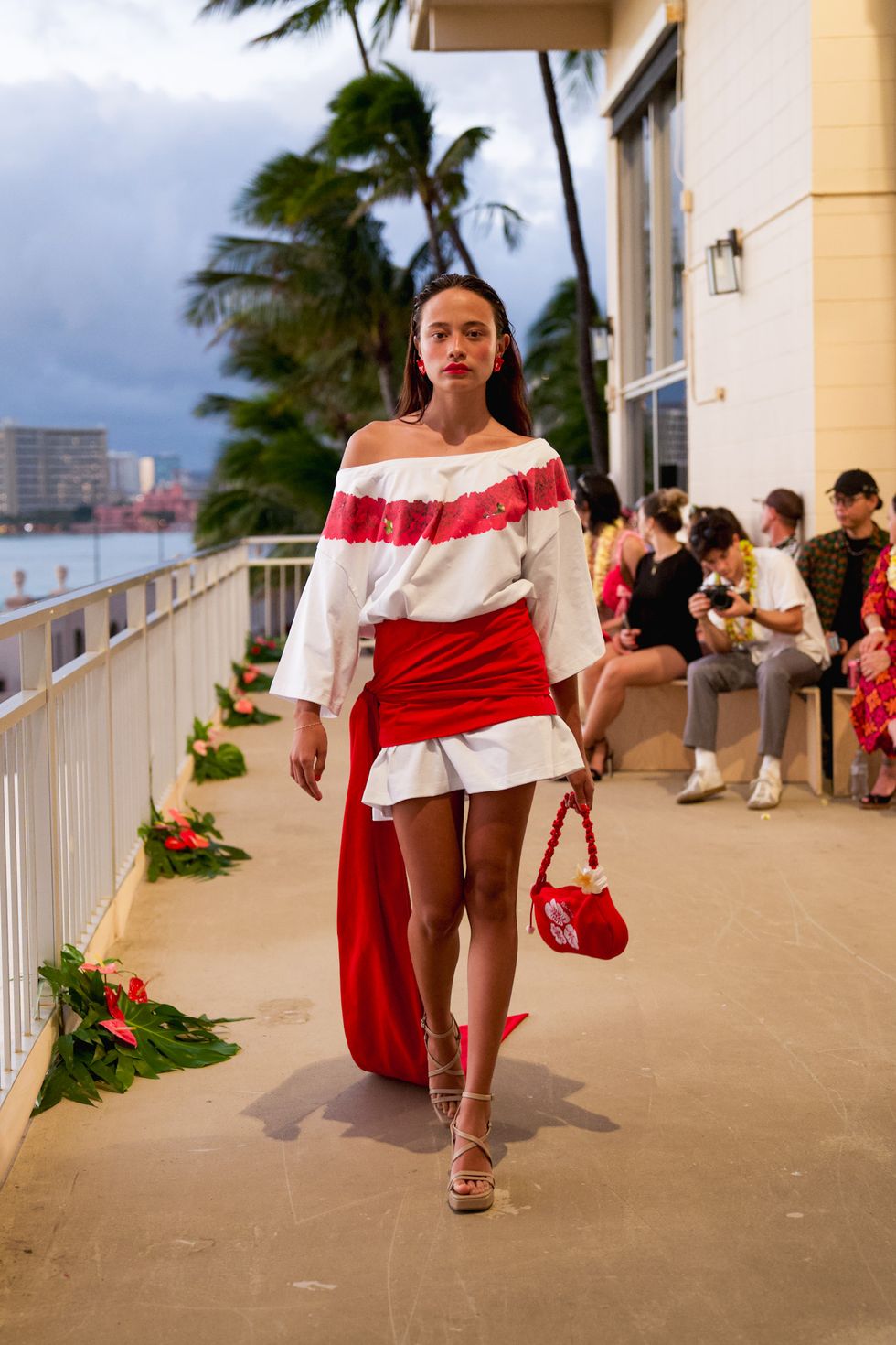 The two-tone pareo-inspired Aloha print that frontloaded the show looked, at a glance, like something fun you might find at an ABC store, the chain of tourist-centric convenience stores that populates nearly every block in Waikiki. That effect was deliberate, but Ahuna worked with graphic designer Cait Tully to develop a print that showcased a flower endemic to the area: pua hau, which grew rampant on the hau bushes that populated Waikiki back when it was a wetland.
