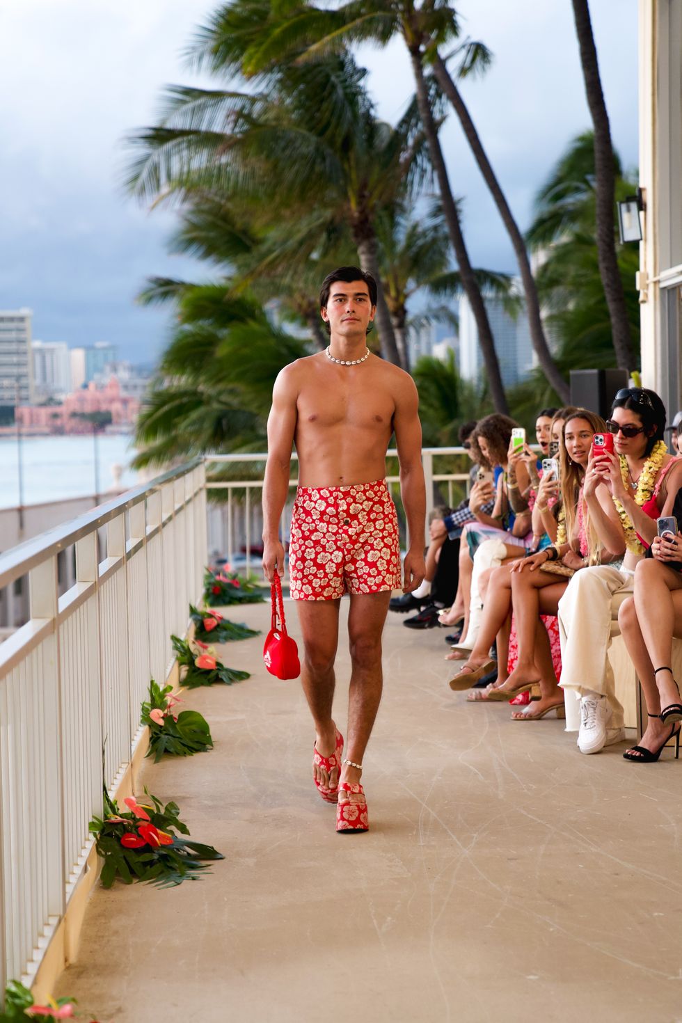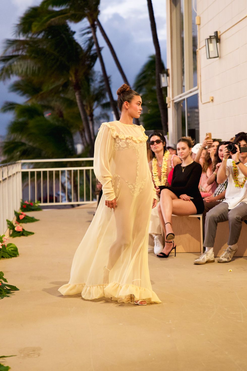 The rest of the collection — titled “KAIMANA,” which means the power of the sea — ranged from barely-there beachwear to voluminous bridal looks, and playfully riffed off traditional silhouettes in ways that felt both nostalgic and new. The models, who were all local and predominantly Hawaiian, strolled down the runway at a nearly glacial pace. “For the walk, I was pretty much like you're taking a stroll through Waikiki,” Ahuna says. “No rush. No rush at all. Everyone's just eating you up.”