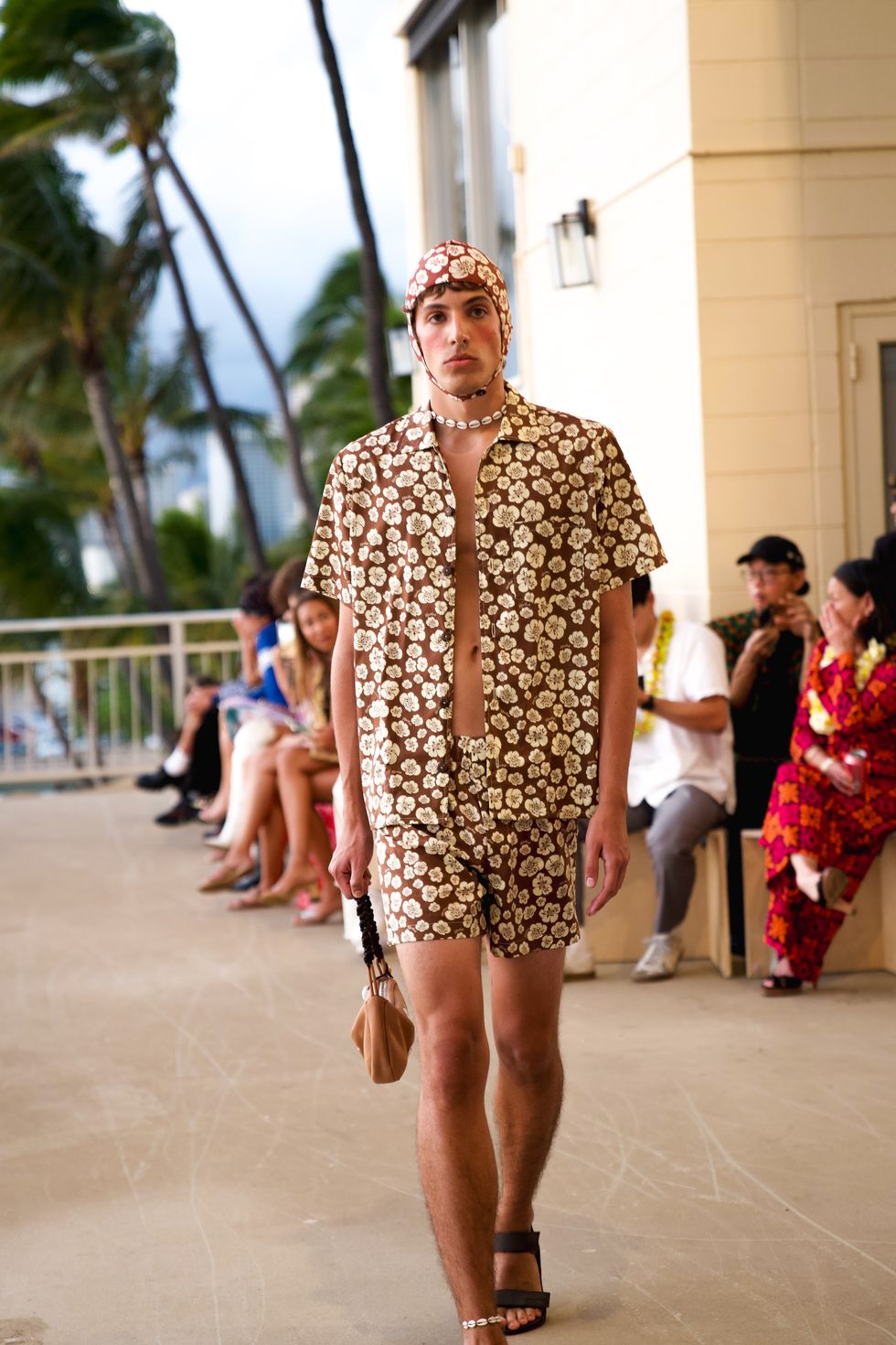 The show started on Hawaiian time — not late, but right as the sun began to dip below the horizon of Kaimana Beach. Guests were given fresh flower lei upon entry, turning the air fragrant with expectation, and eventually took their seats facing the ocean. The percussive boom of a pa’u drum signaled the show’s first look: a loosely tailored brown aloha print suit worn open to reveal a matching bikini top. It was all constructed out of lycra, the stretchy material most recognizable as skin-tight beach attire in Hawai’i, but in Ahuna’s hands it had the fluid, silky sensibility of streetwear.