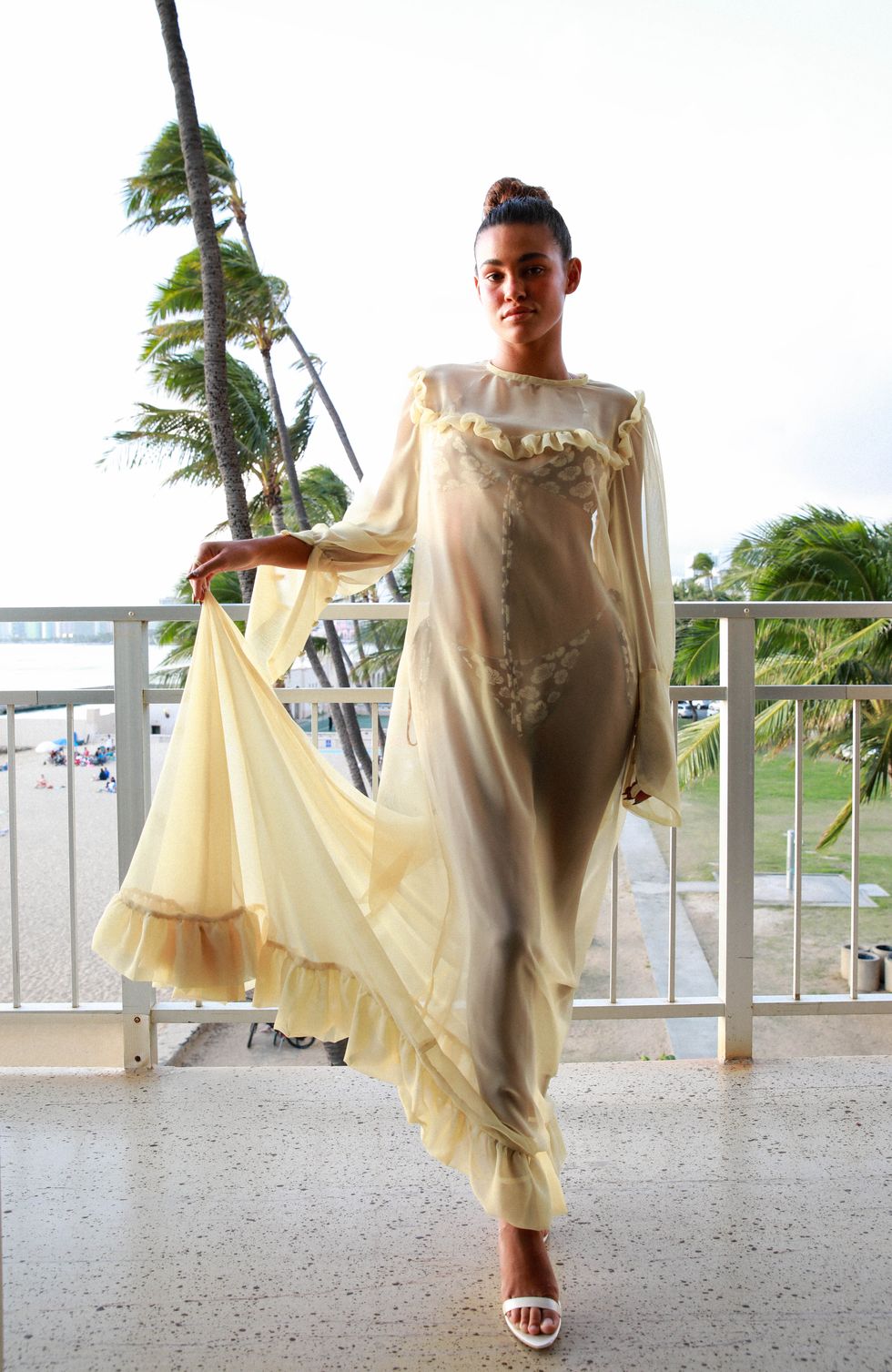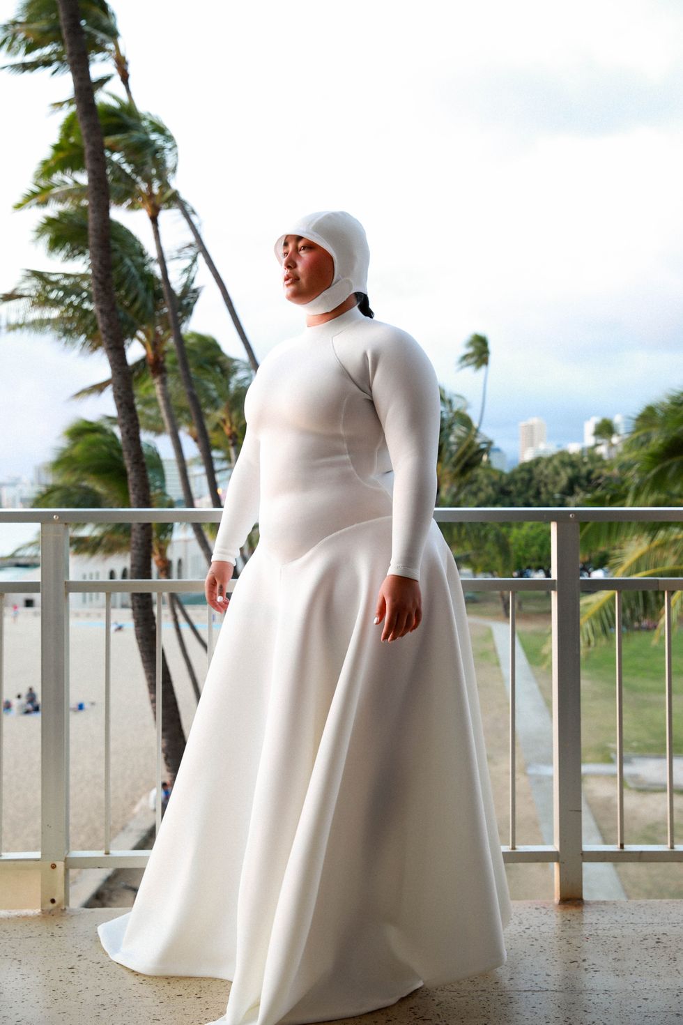 He thinks a lot about camp when he’s designing, and though his clothes don’t scream it, they sometimes contain the sly suggestion of artifice ... a slight wink. Take his backwards, oversized pink Aloha shirt that appeared, head-on, as simply a fashionably slouchy dress. It was only when the model turned that the Aloha shirt revealed itself as something new, through the collar and oversized buttons running down her back. There were also multiple takes on the holokū, a loose formal gown popularized in 19th century Hawai’i, which he interpreted out of lycra and a very sheer cream chiffon, boasting leg-of-mutton sleeves and a train over a lycra bikini. The closing look, a pearlescent wedding dress topped with a swim cap, was made entirely out of neoprene, the stuff of wet suits. That space between tradition and innovation is how Ahuna says he’s come to process what it means to live in Hawai’i today — the constant negotiation between honoring and skewering what constitutes an “authentic” Hawai’i. “With this collection I wanted to make more authentic tourist wear and play off of those ideas — to have fun with the things that we interpret as ‘tourists’ wear,’” Ahuna says.