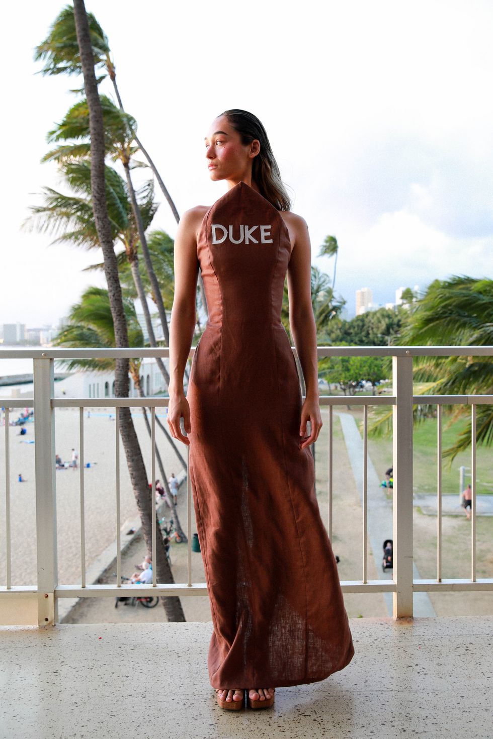 Towards the end of Rocket Ahuna’s debut show on March 22, staged on the second floor lānai that wraps around the ballroom of the Kaimana Beach Hotel in Waikiki, I noticed a woman sobbing. She turned her face away from the dress as if to shield herself from it, wiping away her tears. The dress in question was made out of a brown linen and corseted, forming the shape of a surfboard’s tip above the model’s bust. Four letters stitched across the nose of the board proclaimed its owner: DUKE. If you know you know, and for many guests in attendance — which included Evan Mock, stylist Taylor Okata, and local designers like Matt Bruening — the reference proclaimed an inherent knowingness, an image both cheeky and deeply Hawaiian.