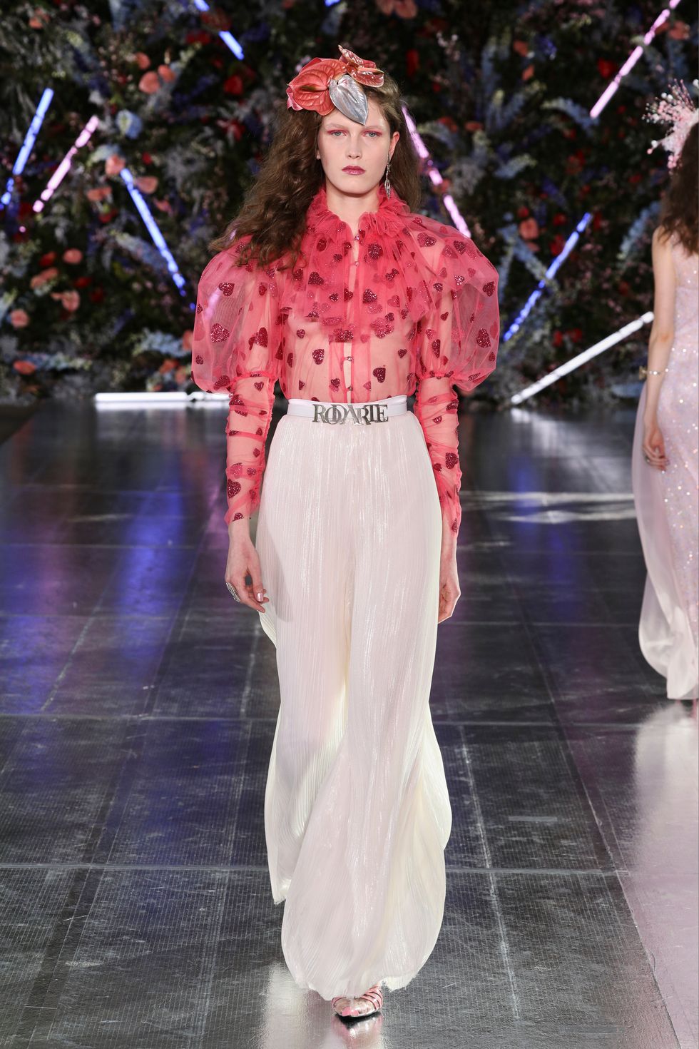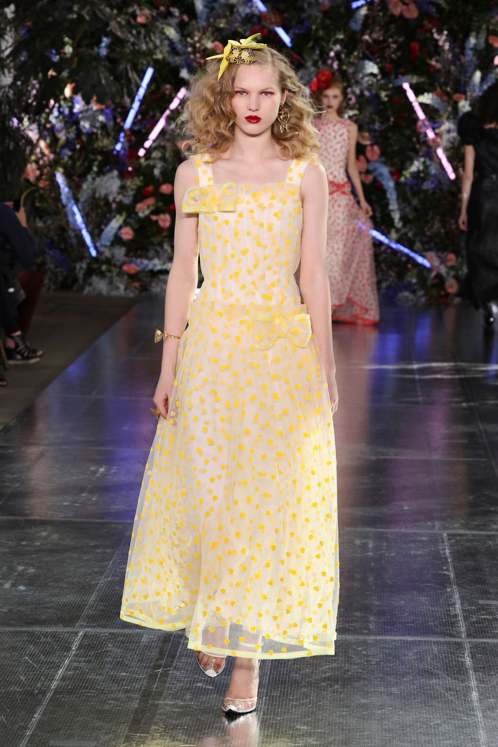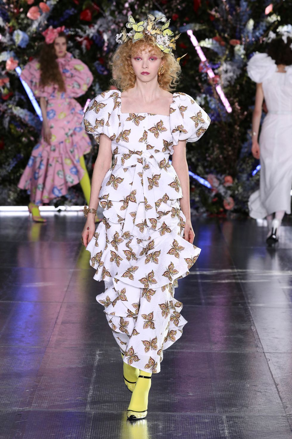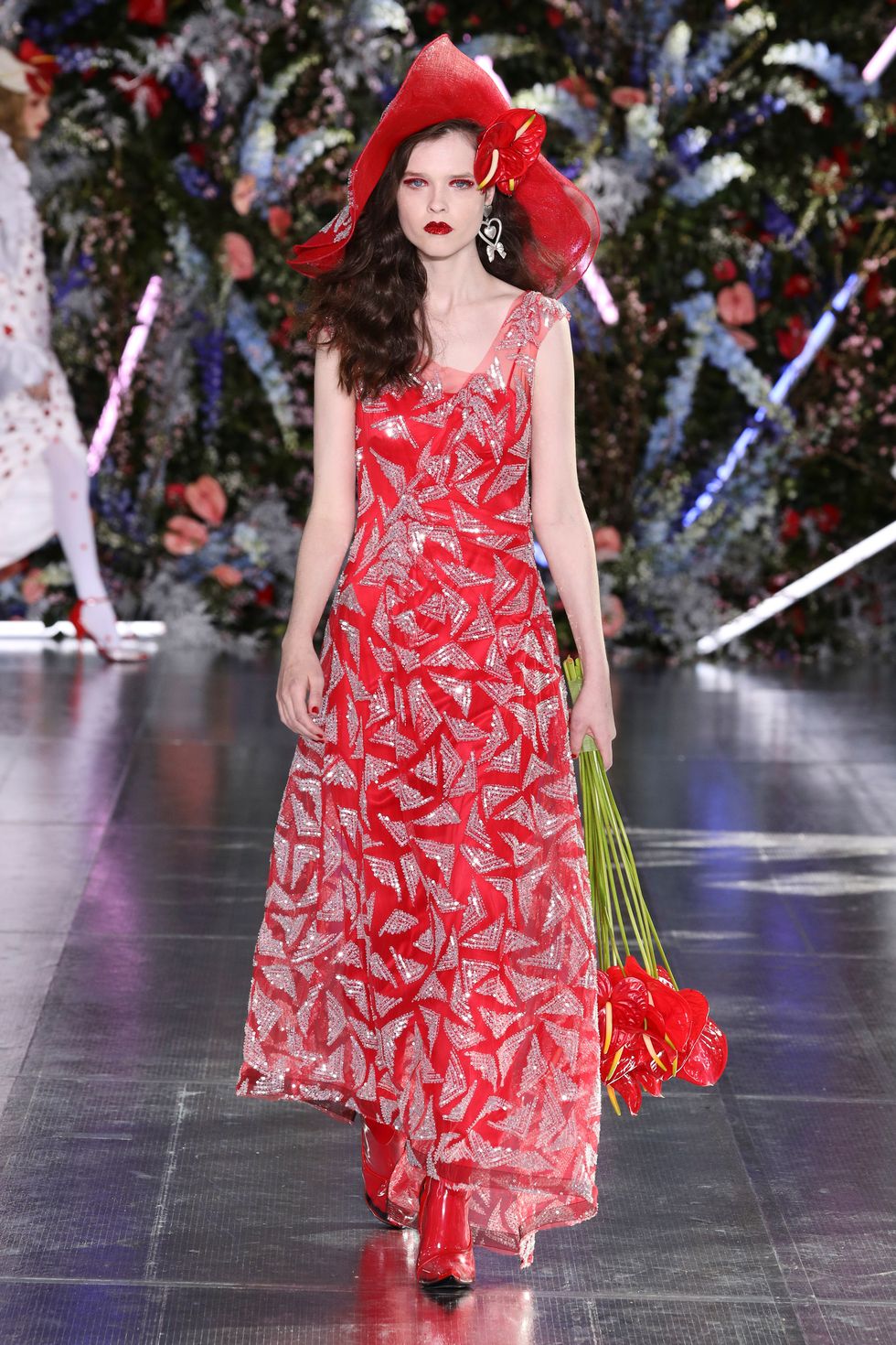 The show was set up as a kind of garden party, and one model even carried massive red flowers down the runway (which matched her floral hat). A mix of models wore real, bold flowers in their hair to correspond with their outfits and many of them were also wearing butterfly headpieces. With lush glitter makeup and larger-than-life curls, the Rodarte sisters went all out on the details.