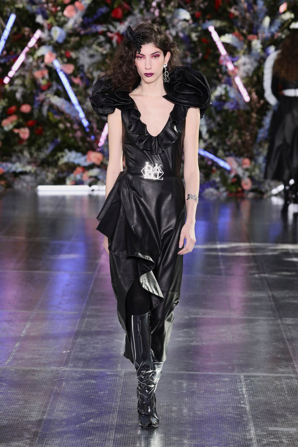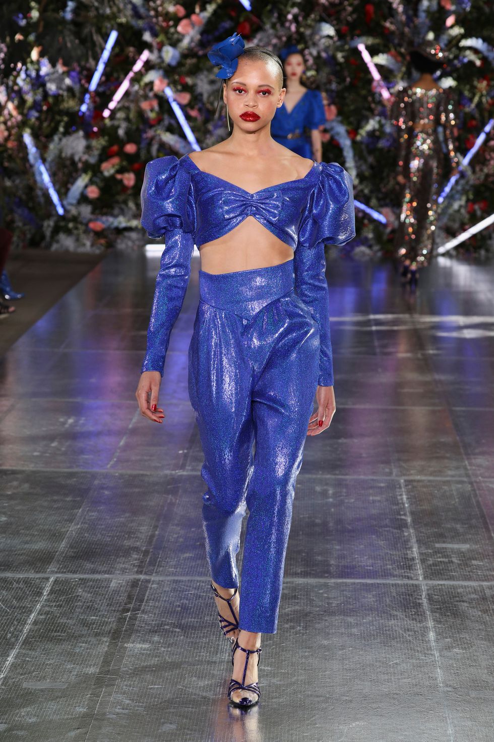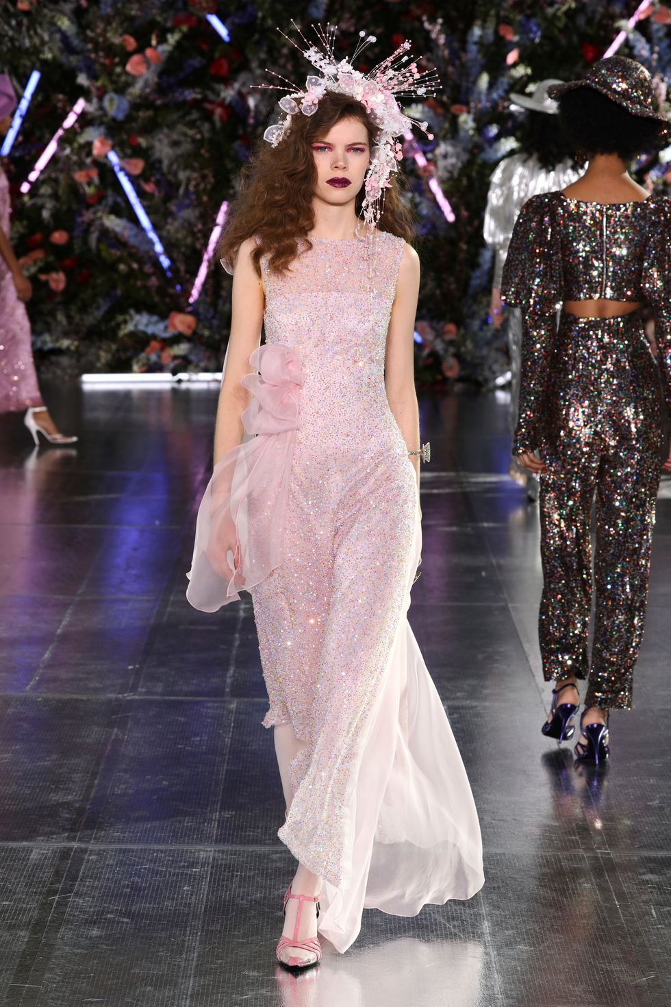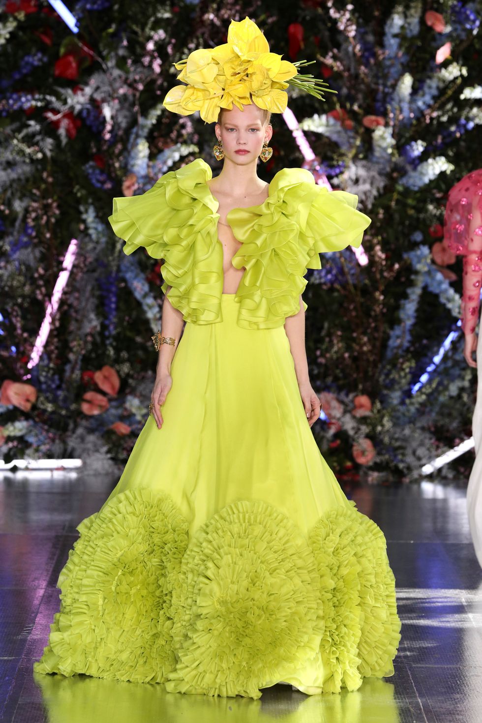 The show was set up as a kind of garden party, and one model even carried massive red flowers down the runway (which matched her floral hat). A mix of models wore real, bold flowers in their hair to correspond with their outfits and many of them were also wearing butterfly headpieces. With lush glitter makeup and larger-than-life curls, the Rodarte sisters went all out on the details.