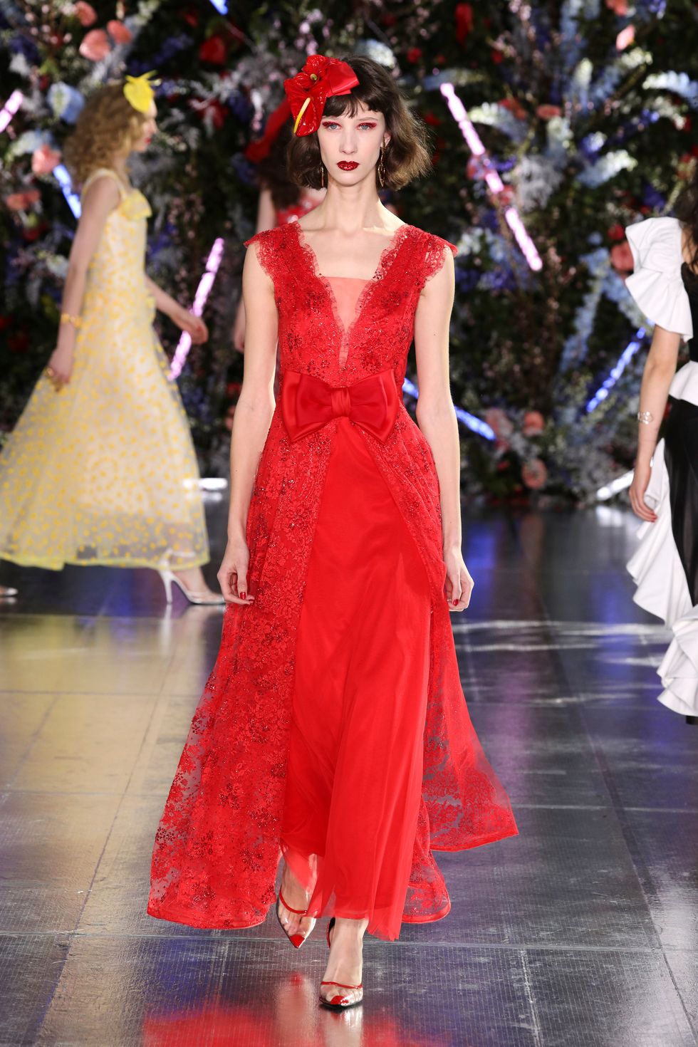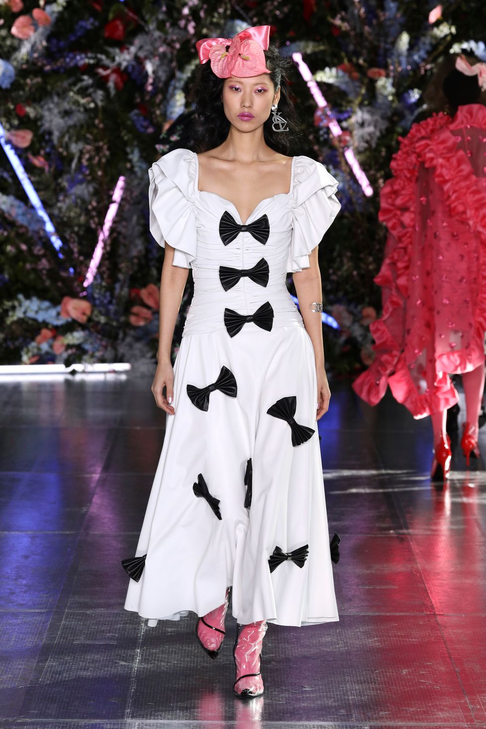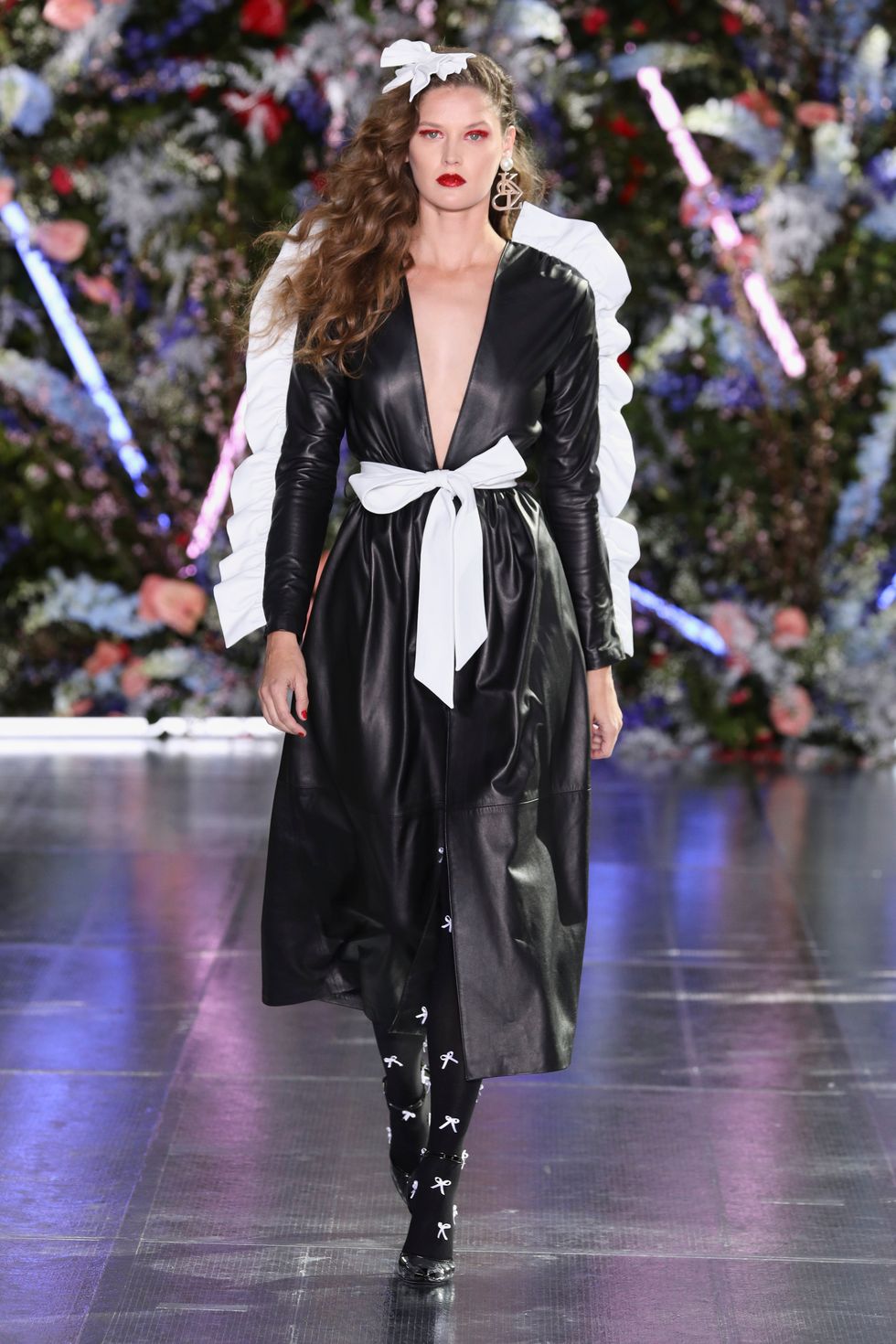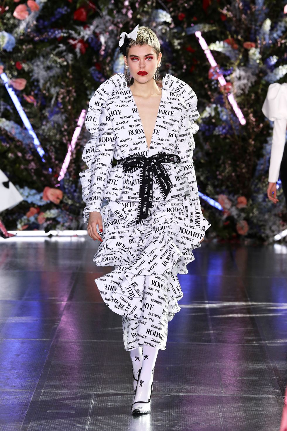 A defining motif of the collection was the bow: present on the waist tied over dresses, worn in curled, supersized hair and in the form of prints in ruffled layers. Stiff black bows were sewn onto structured white dresses and little red ones made of tulle were worn proudly like brooches. Basically any kind of bow you can imagine; Rodarte did it all.