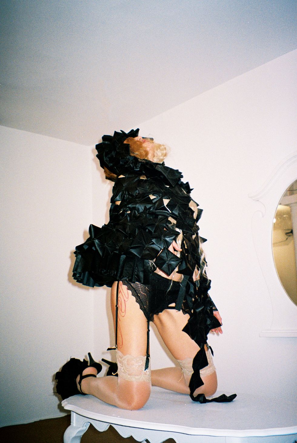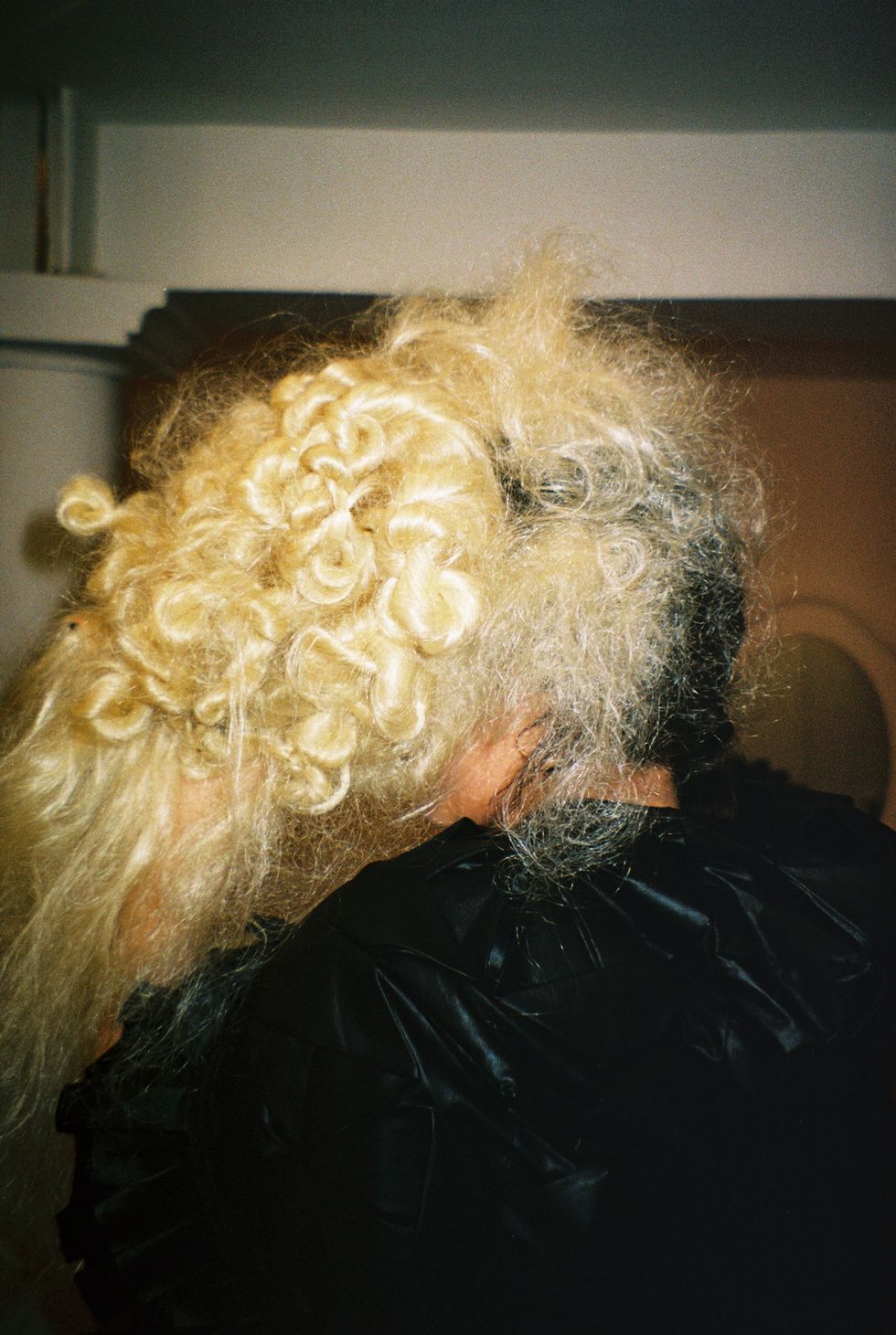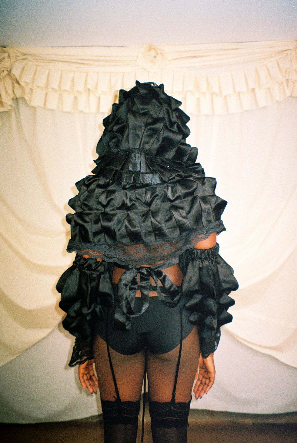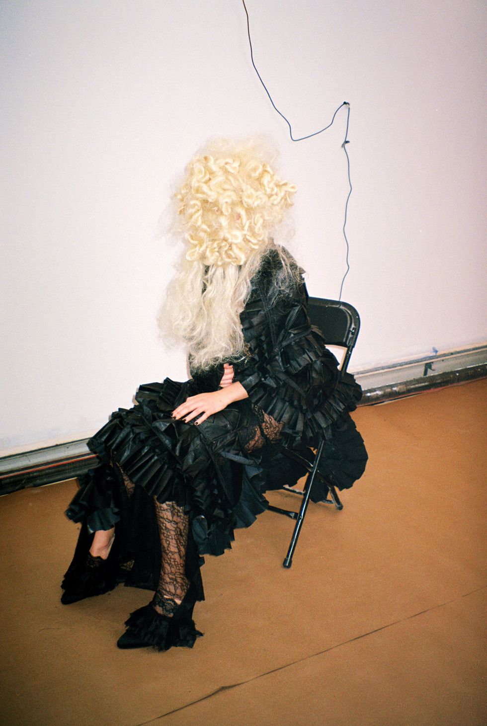 It made me imagine people who are bored of living as humans so they try to become insects. Their faces are covered with hair because they’re trying to be more introspective. It's more about their feelings and thoughts and how they want to create these shields. They are probably living in a Victorian time, which is the connection with the shapes. With the models you can see the process of becoming an insect: There’s one that’s more in a cocoon, one is just born, others that are reborn and changing their skin and one is fully the queen.