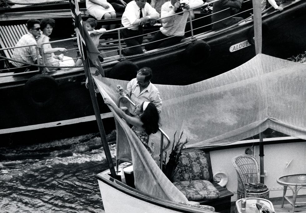 Another time, I did a bizarre thing with Elizabeth Taylor and Richard Burton. They had a yacht in London called the Kalizma named after their three daughters: Kate, Liza, and Maria, moored on the Thames. They went to the yacht on weekends only because they were filming (Elizabeth Taylor was filming The Only Game in Town with Warren Beatty and Man of 1000 Days was being filmed with Richard Burton). So I decided to spend a weekend in this warehouse, for the weekend of a big party. I got a shopping bag full of food, and Friday at 2 pm I went to the watchmen in the warehouse and I gave them 15 dollars. I said, "Lock me in until Monday morning." So I couldn't get out of this warehouse from Friday to Monday, and I got great pictures of Richard Burton and Elizabeth Taylor in their yacht. One of my favorite shots shows Elizabeth Taylor and Ramone, the yacht steward putting up gauze curtains.