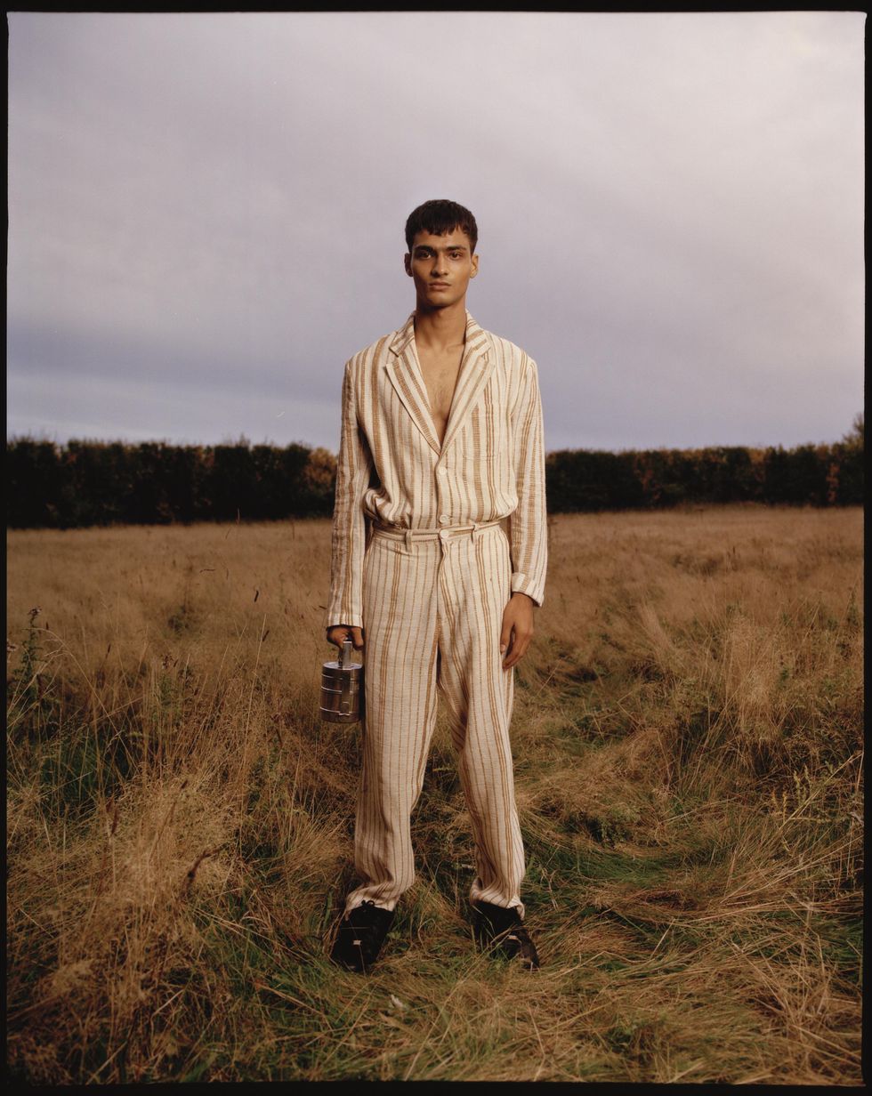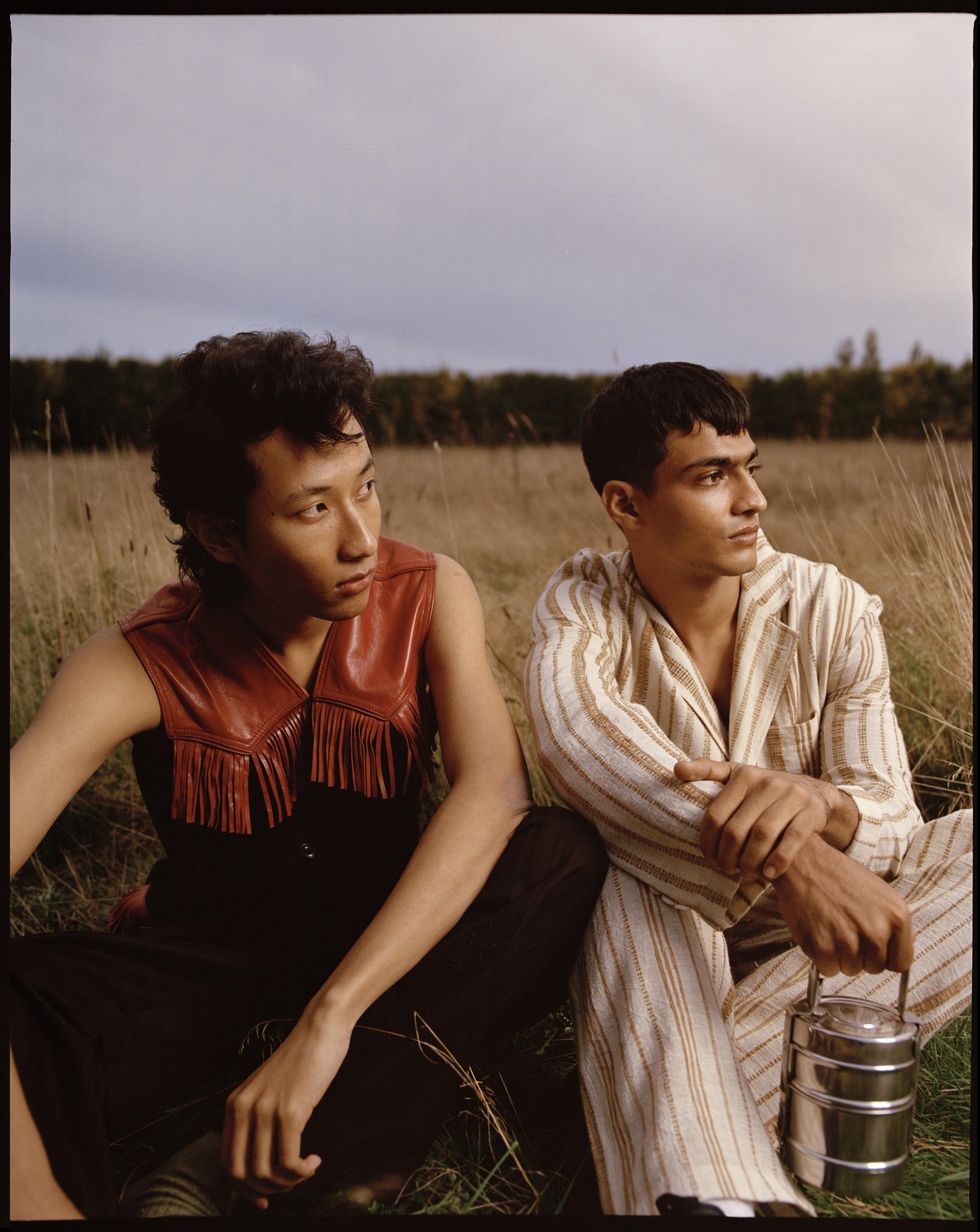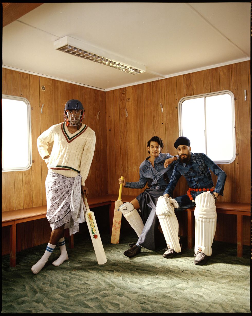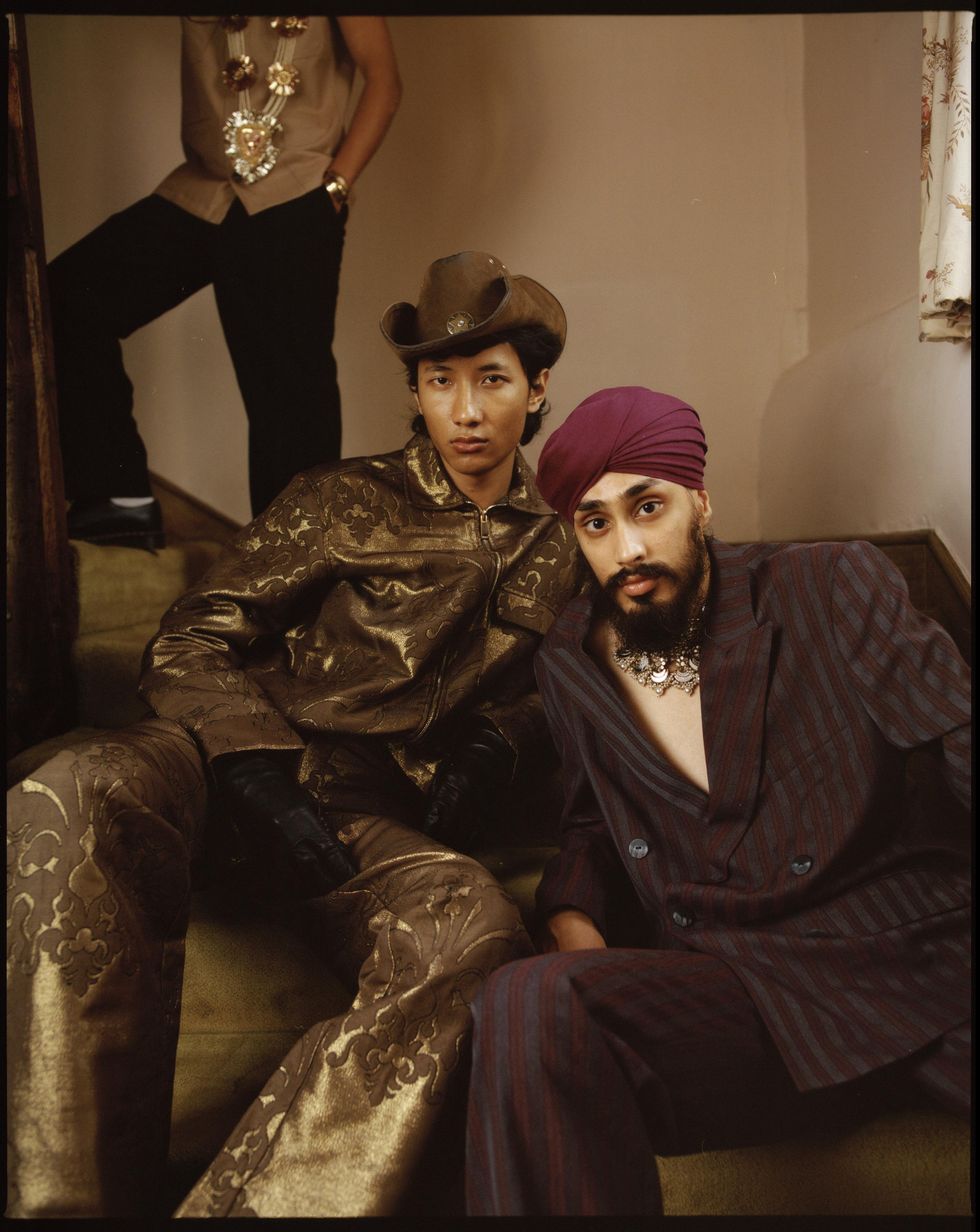 (On Jacob) Jacket: Andersson Bell, Shoes: Giorgii, Accessories: JJMN.STUDIO; (On Dinesh) Clothing and accessories: JJMN.STUDIO; (On Karanjee) Clothing and accessories: Ahluwalia, Shoes: Model's own, Accessories: JJMN.STUDIO