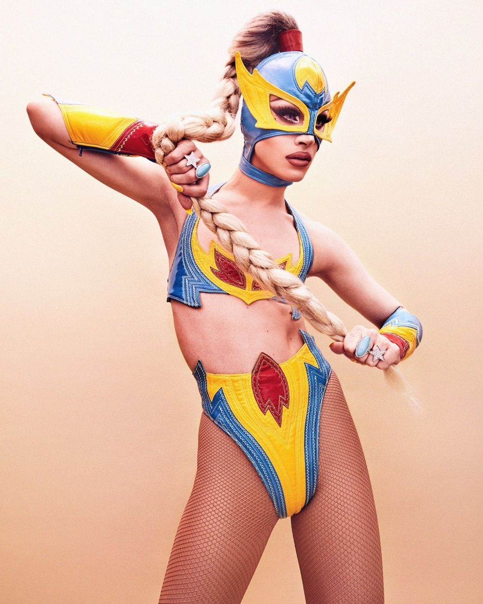 The standout piece was her Alaskan Winter Realness, a Luchador-inspired bikini the queen designed as a fashion student at FIT that was brought to life by NYC design duo Dick and Virgil. We caught up with one half of the queer design team — who also worked with BCALLA on Aja's All Stars kawaii anime fantasy — to get the skinny on their piece for this skinny legend.