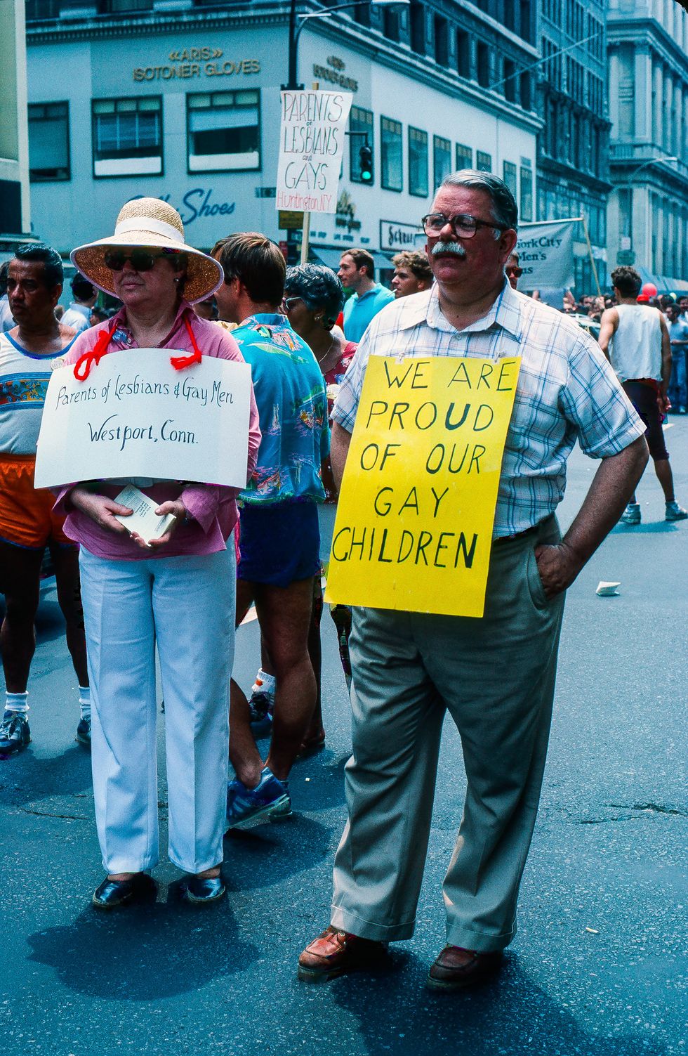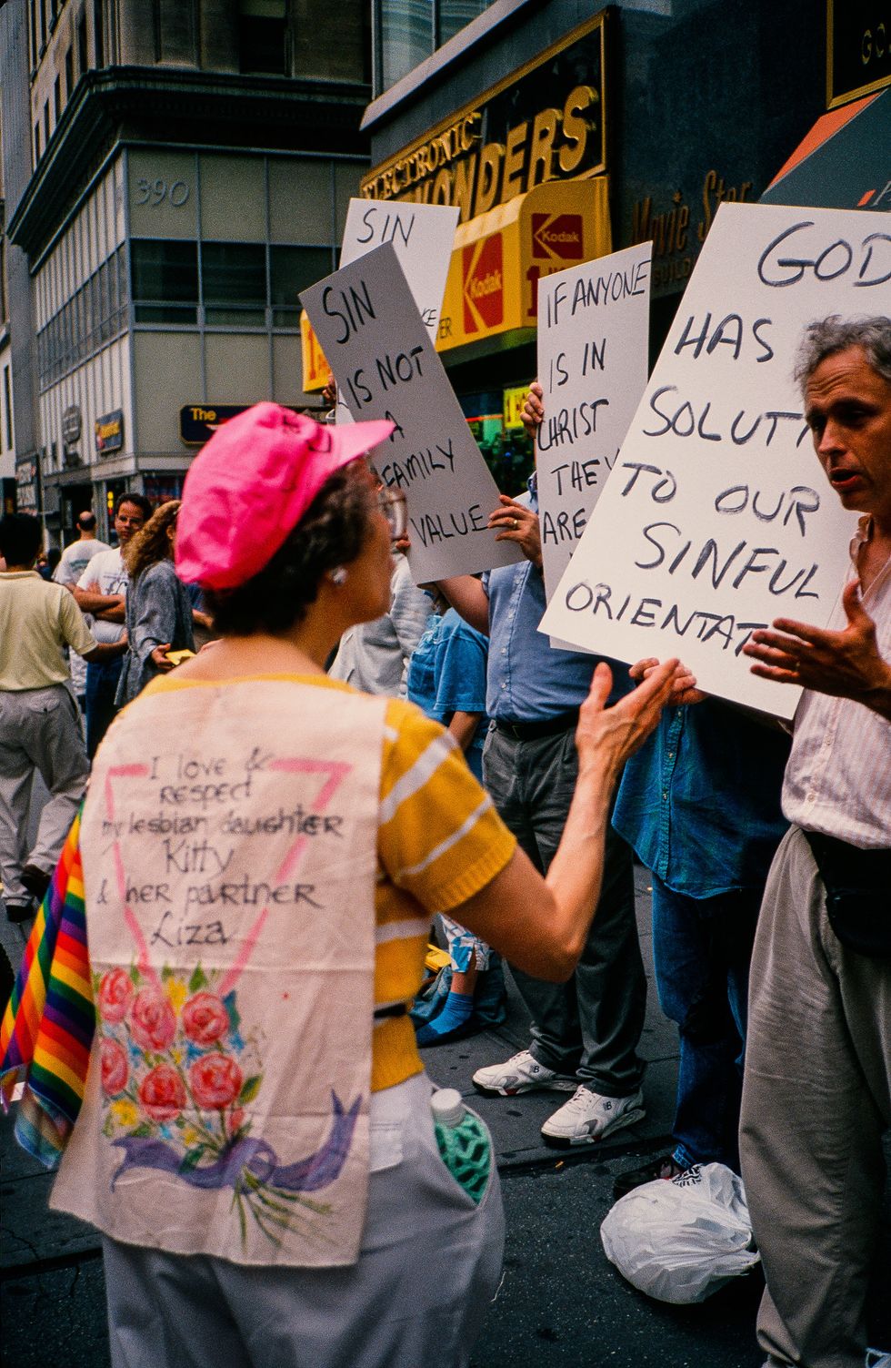 Her images don't neglect the hatred lurking just on the other side of the barricades, exposing the counter-protestors who used to gather along the parade route and at St. Patrick's Cathedral. Among the attendants, they also trace the trajectory over time, of queer culture's precarious relationship with the mainstream, as increasing numbers of "Grandma for Gays," and "I Love My Lesbian Daughter" apparel and and politicians like Rudy Giuliani join the ranks in her photos, while "allyship" and the "gay vote" became household terms.
