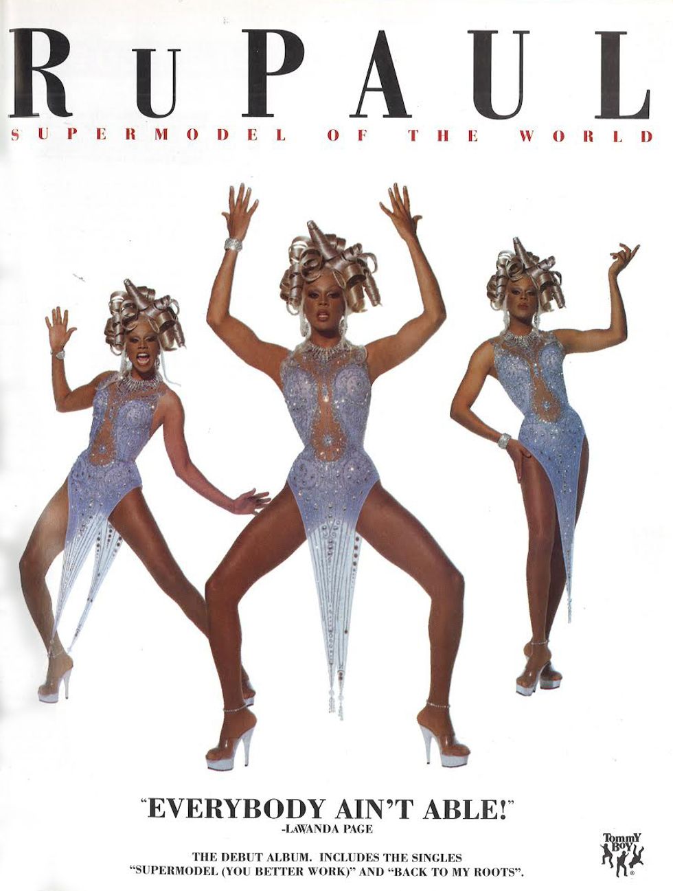 "It's so funny," says RuPaul, "because supermodeling has been in my peripheral existence for such a long time. As a drag star, I do a lot of shoots and wear lots of fancy clothes. Also my character Star Booty had been America's top black supermodel turned crime fighter, so Supermodel is kind of a sequel to Star Booty. And all the girls I name in the song -- like Linda [Evangelista], Christy [Turlington] and Naomi [Campbell] -- relate to the song on the level that they too are drag queens; they know that there's what's projected on the runway or the pages of a magazine, but there's a real person underneath all that. The modeling industry has taken on the glamour booth that Hollywood used to give to us but they don't anymore. We are all glamour pusses. We all love to pose right now, especially with voyeurism being at an all-time high everyone is getting the chance to be a supermodel, to sashay, shante on the runway."