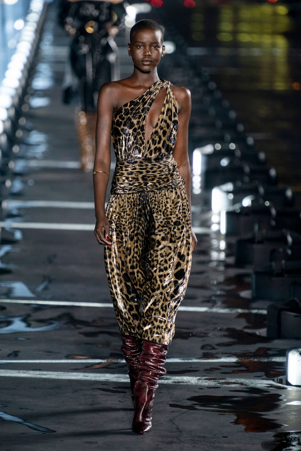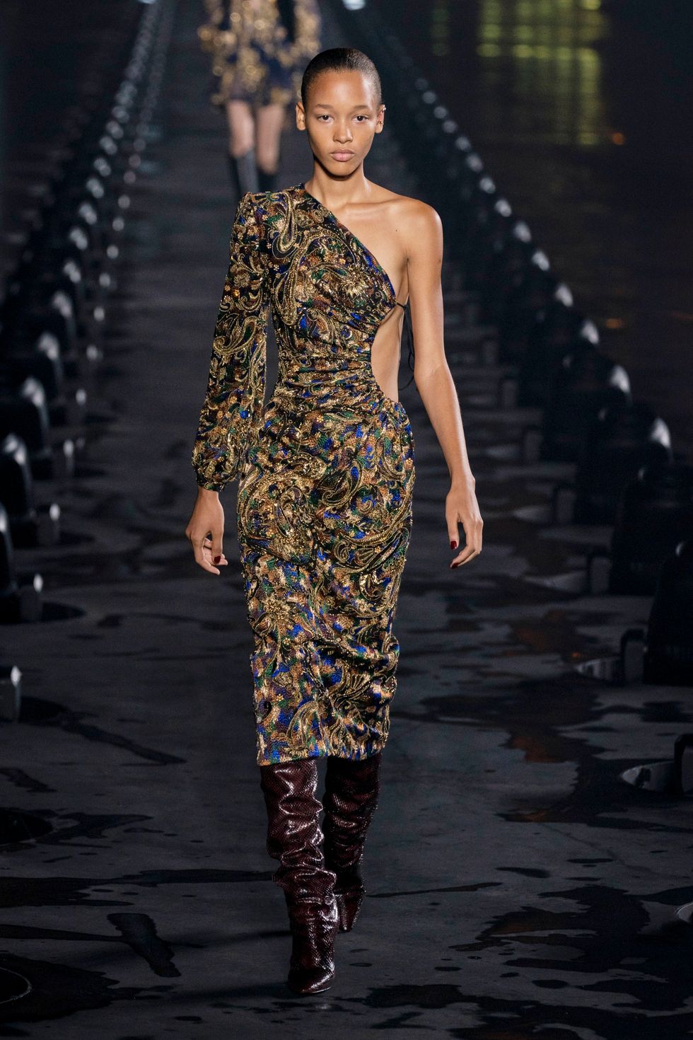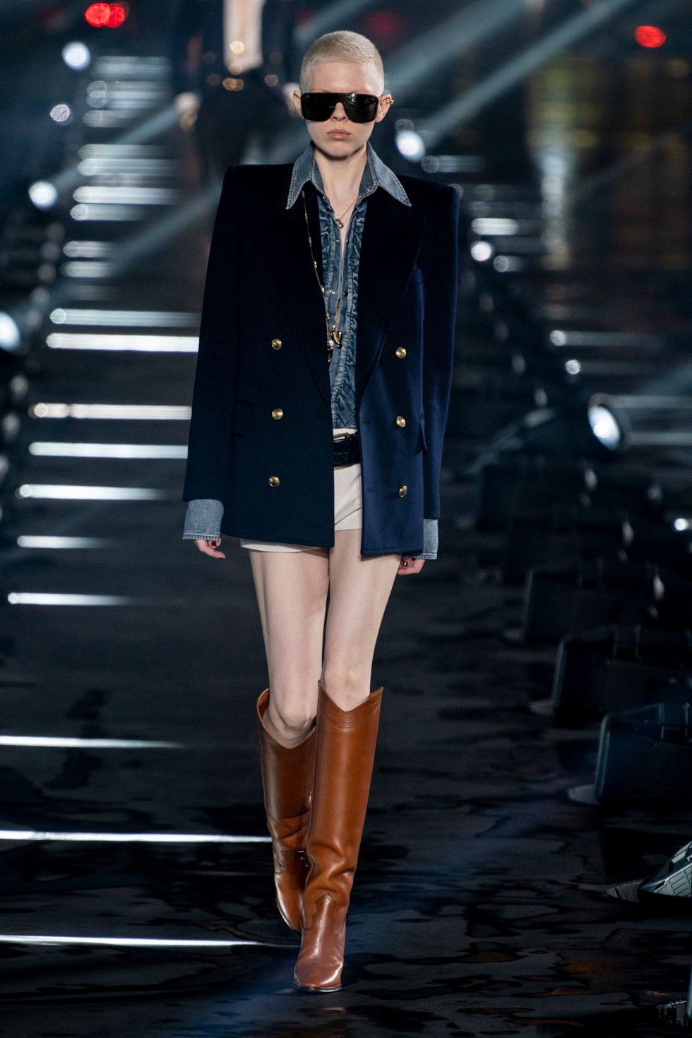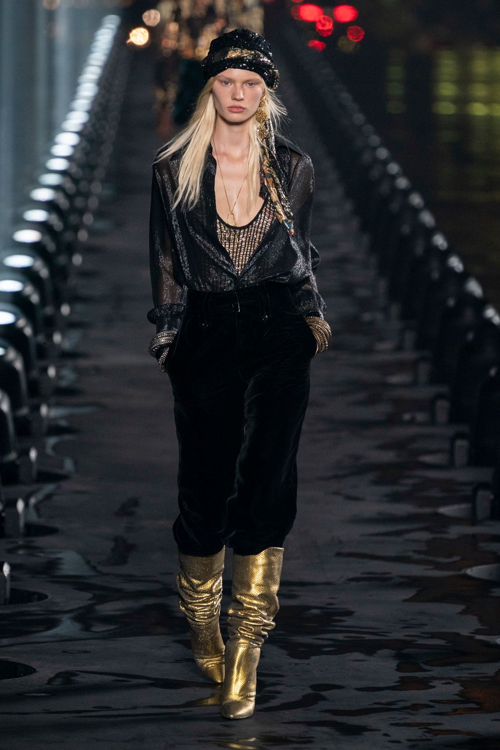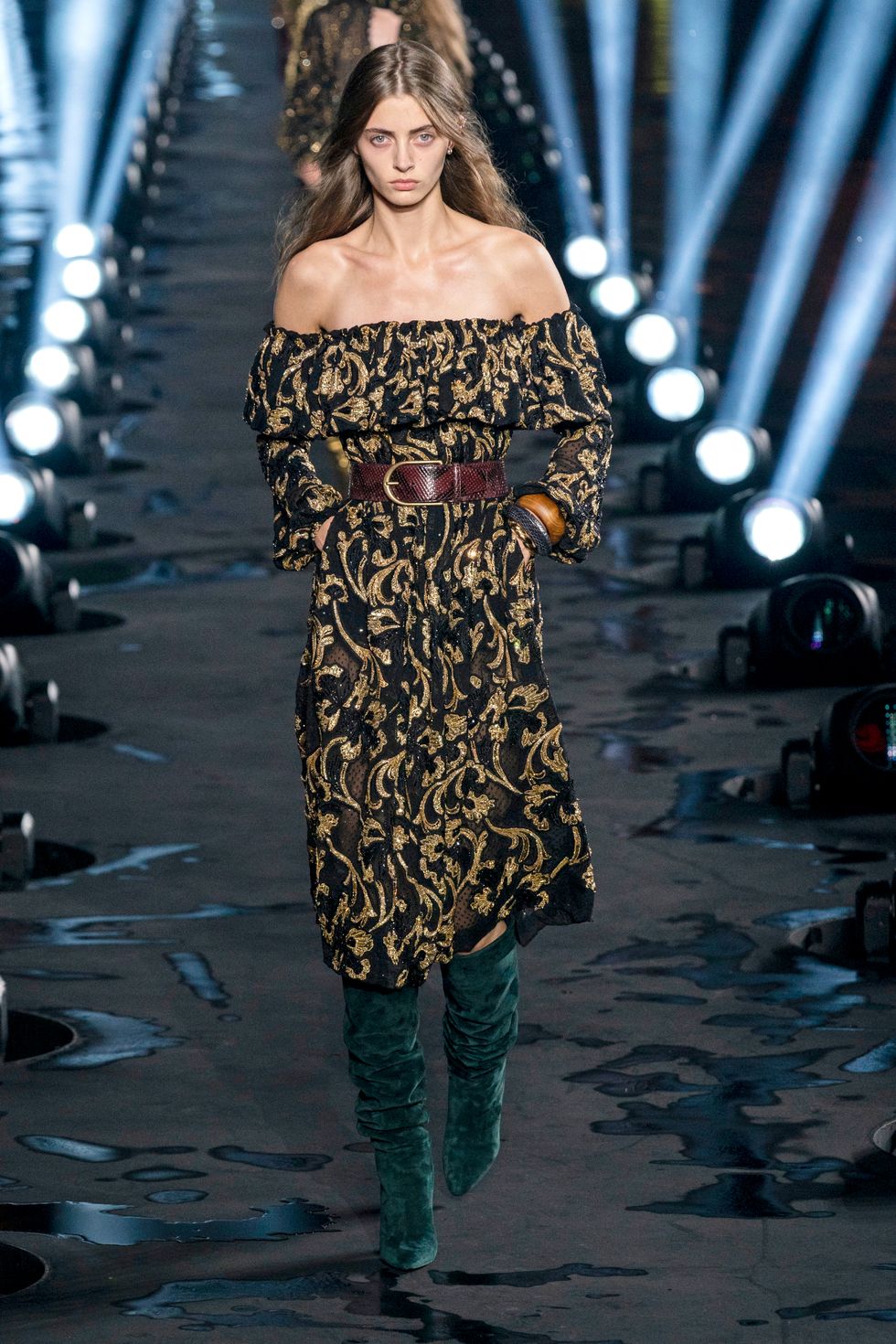 One of Vaccarello's first big hits at Saint Laurent was a pair of slouchy, knee-high glitter boots from fall 2017, which Rihanna famously wore straight off the runway. And so it makes sense that for this season, the designer zeroed in on one of the boho era's signature trends: slouchy boots, generally styled with long, loudly patterned dresses. He showed them in a number of colors and fabrics — snakeskin, velvety suede, buttery leather. They seem to be a lasting trend; Vacarello showed a few pairs last season, as did Isabel Marant (who never gave up on boho chic) and Hedi Slimane at Celine (RIP the accent mark).