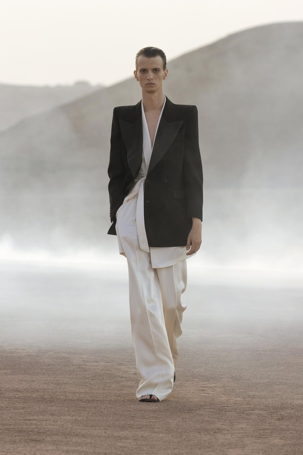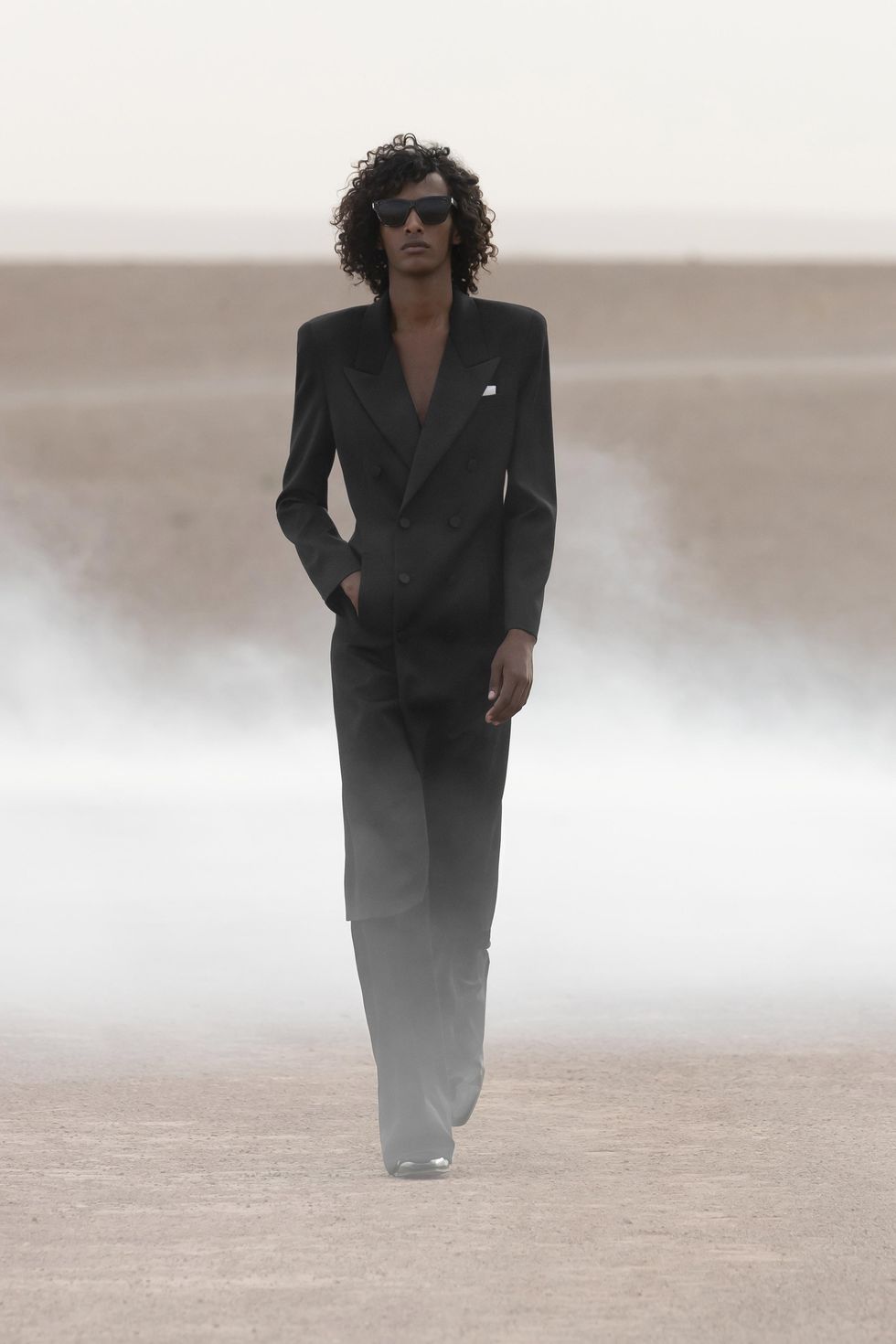 Today's Spring 2023 Men's outing in Marrakech's Agafay Desert was equally as serene and otherwordly. There was a ring-like, haze-emitting structure set against the Moroccan sunset as models circled around in tuxedo variations, fluid coats and relaxed, linear shapes not unlike the women's collection shown in Paris earlier this year.